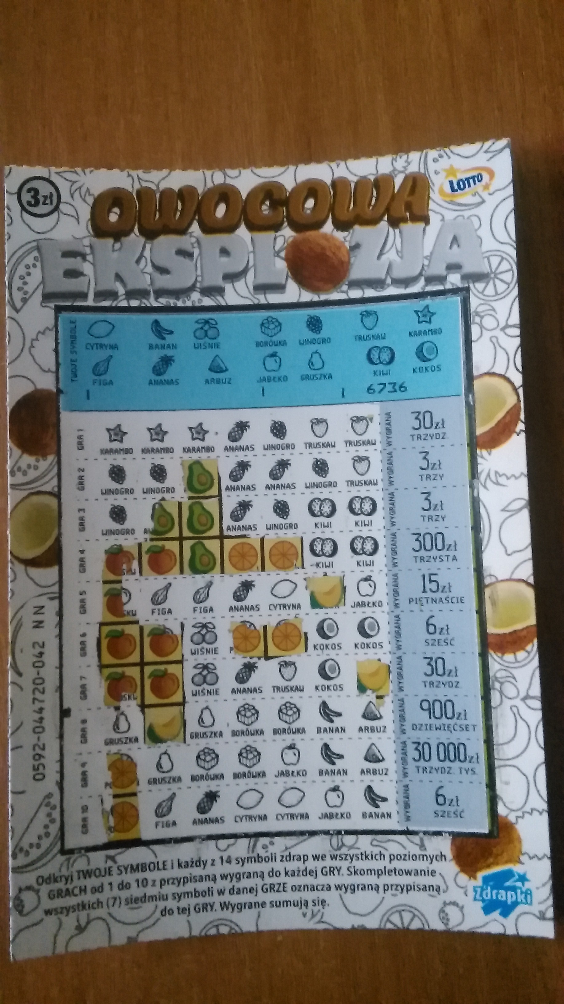 Zdaję sobie sprawę że najbardziej atrakcyjne zdrapki to teraz MP, XXL, małe linie, na tropie kasy, as król dama i bond. Niestety wielu z nich od dawna nie widuję w kolekturach a jak są to nieatrakcyjne paczki. Jak już pisałem wcześniej, z braku laku sięgam po owocową którą powoli też można brać pod uwagę. Moze jakimś cudem wleci 300, 900 lub 30k. Na razie pociesza mnie fakt że jestem w tej zdrapce na plusie. Jednakowoż nie zamierzam brać jej garściami, raczej symbolicznie co kilka dni wezmę 2-3 sztuki i starczy