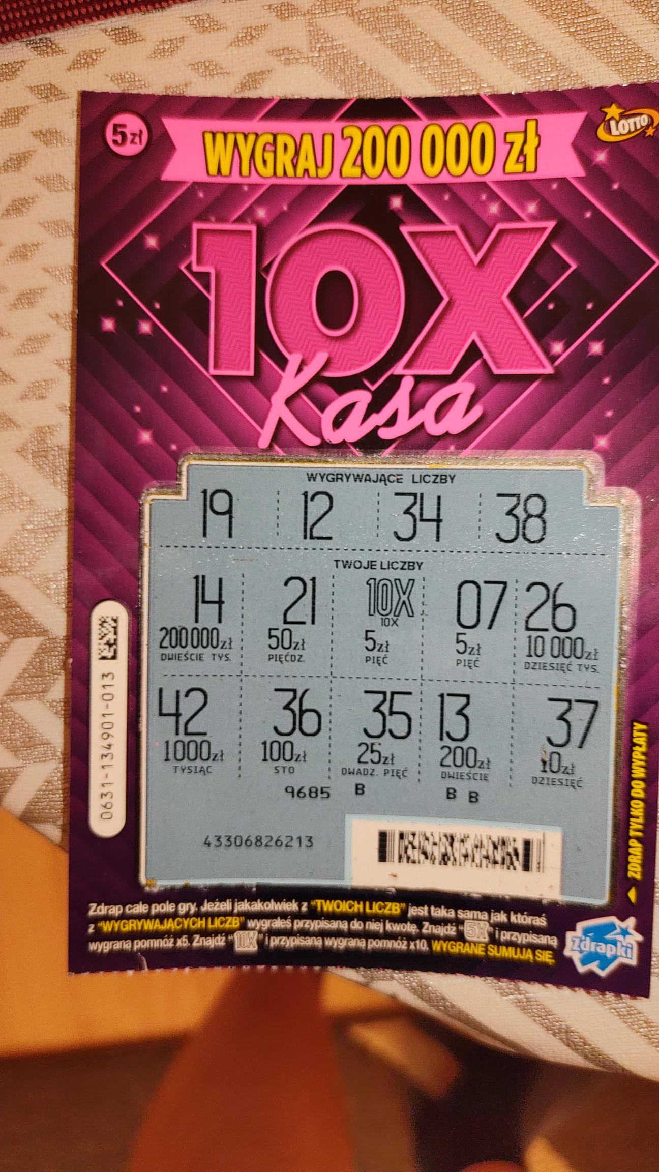 Tak patrzę że zeszła już połowa nakładu i nikt jeszcze głównej nie trafił. Natomiast padły już 4 nagrody II stopnia po 10.000. Z początku cieszyłem się na tę Kasęx10 ale nie jest ona dla mnie szczęśliwa. Kilka razy miałem piątkę i dyszkę i nic powyżej i stosunkowo dużo pustaków :-\