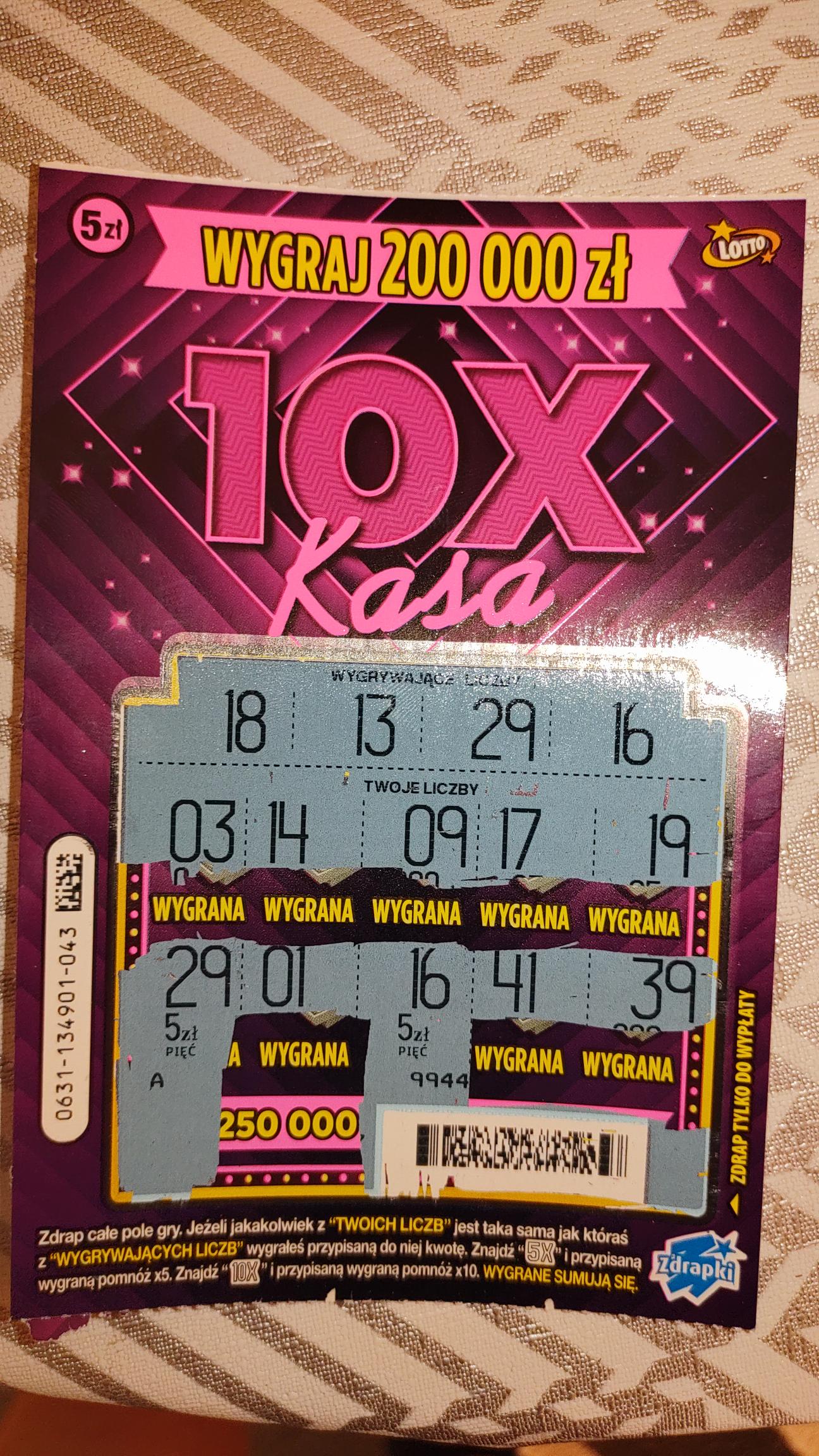 Tak patrzę że zeszła już połowa nakładu i nikt jeszcze głównej nie trafił. Natomiast padły już 4 nagrody II stopnia po 10.000. Z początku cieszyłem się na tę Kasęx10 ale nie jest ona dla mnie szczęśliwa. Kilka razy miałem piątkę i dyszkę i nic powyżej i stosunkowo dużo pustaków :-\