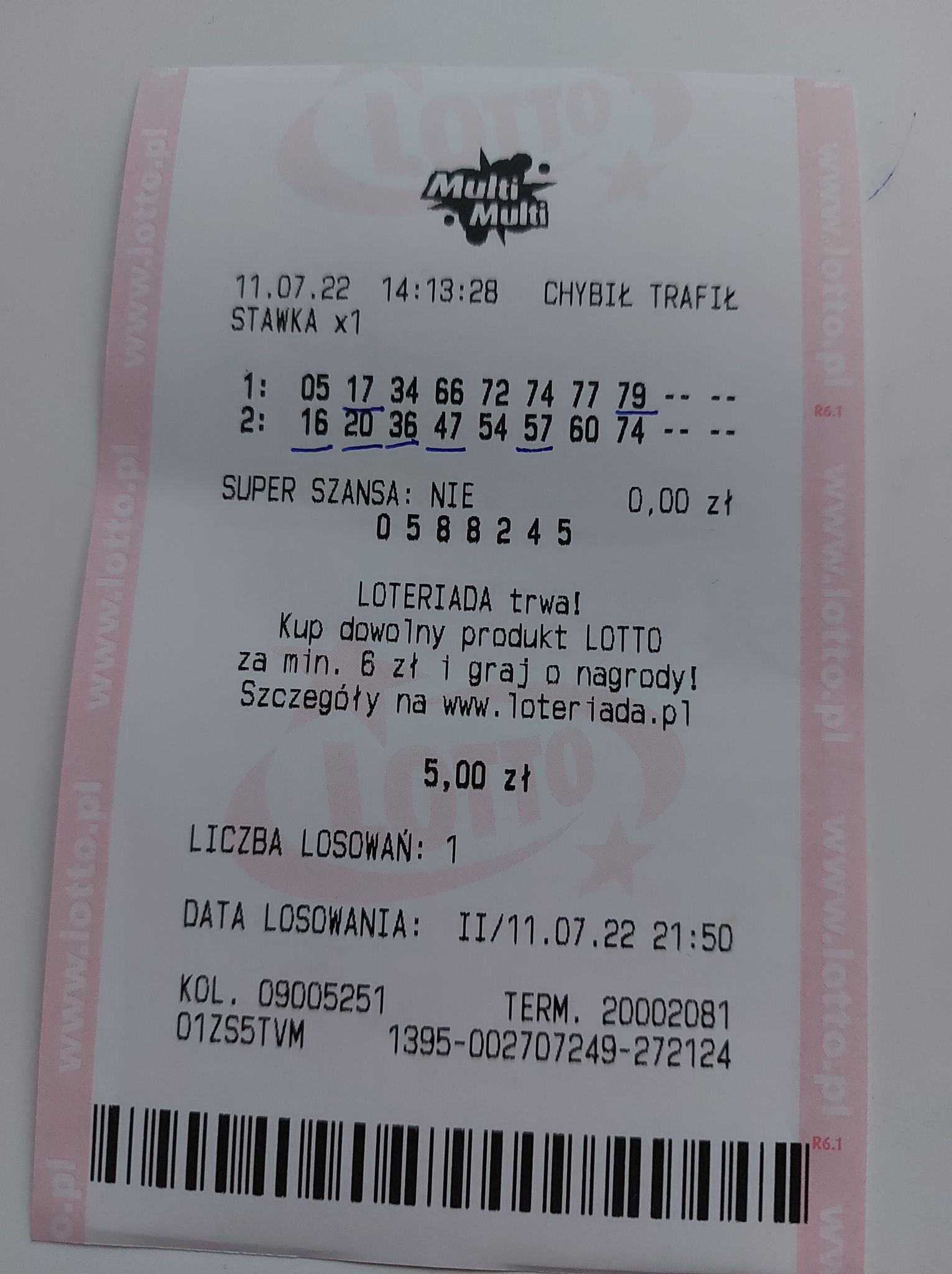 O 14 weszło 4/7, o 22 2/7... czyli no, 6 zł za zakład na dwa losowania. Puszczę jutro bez szaleństw jeden bez plusa na 4 losowania ; )