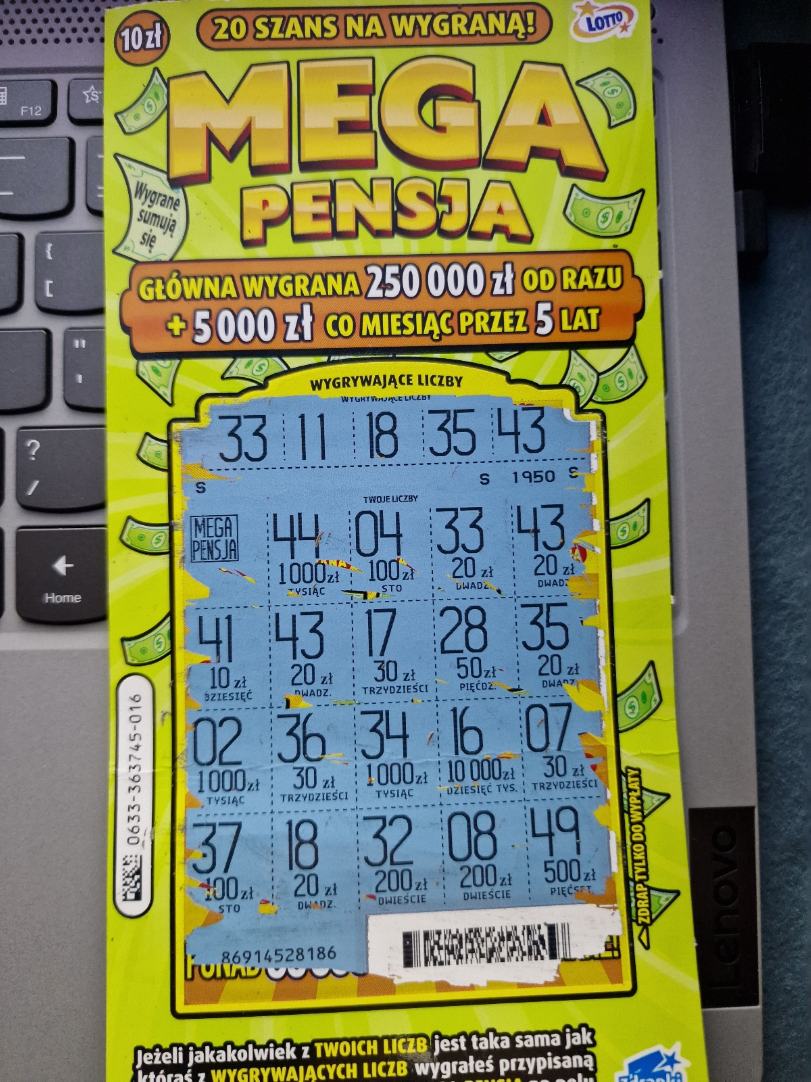 Ku zdziwieniu spotkałem dzisiaj wersję żółtą, wziąłem jedną i niestety pustak. U mnie można teraz spotkać wszystkie wersje kolorystyczne tej zdrapki, najczęściej jednak nieatrakcyjna już zielona