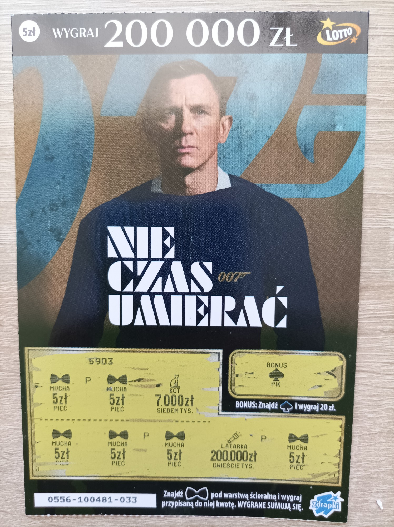 Spotykacie jeszcze tego bonda? Od kilku tygodni już praktycznie nie widuję tej zdrapki, a ostatni raz jak je kupowałem to były jakieś inne, mniej ciekawe nr paczek zaczynające się 09xxxx. Jednak te z początku sprzedaży (035xxx) bardziej mi pasowały.