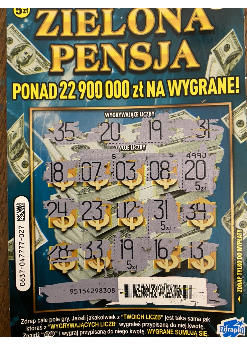 Podczas polowania na ŚO poprosiłem po jednej dodatkowej zdrapce i Pani w Górze Kalwarii podała mi jeden egzemplarz ZP i zobaczcie co wydrapałem
