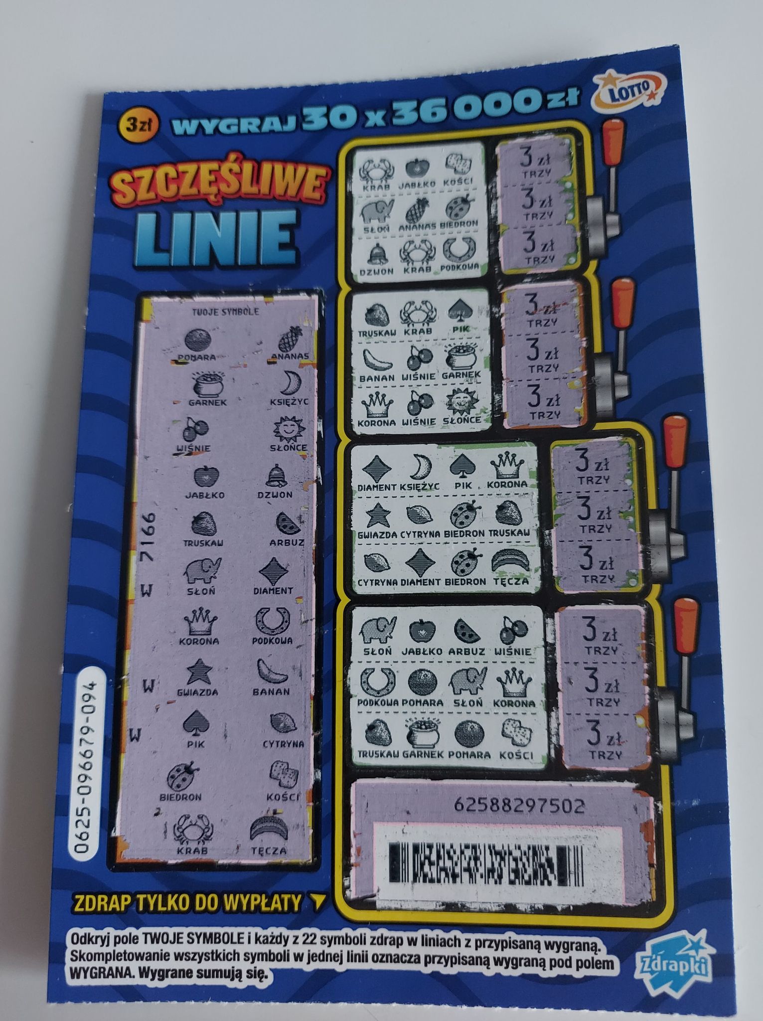 Taki przypadek: zdrapalem 4 symbole i ulozyla sie linia. Apetyt byl spory a wygrana to ...6zl.