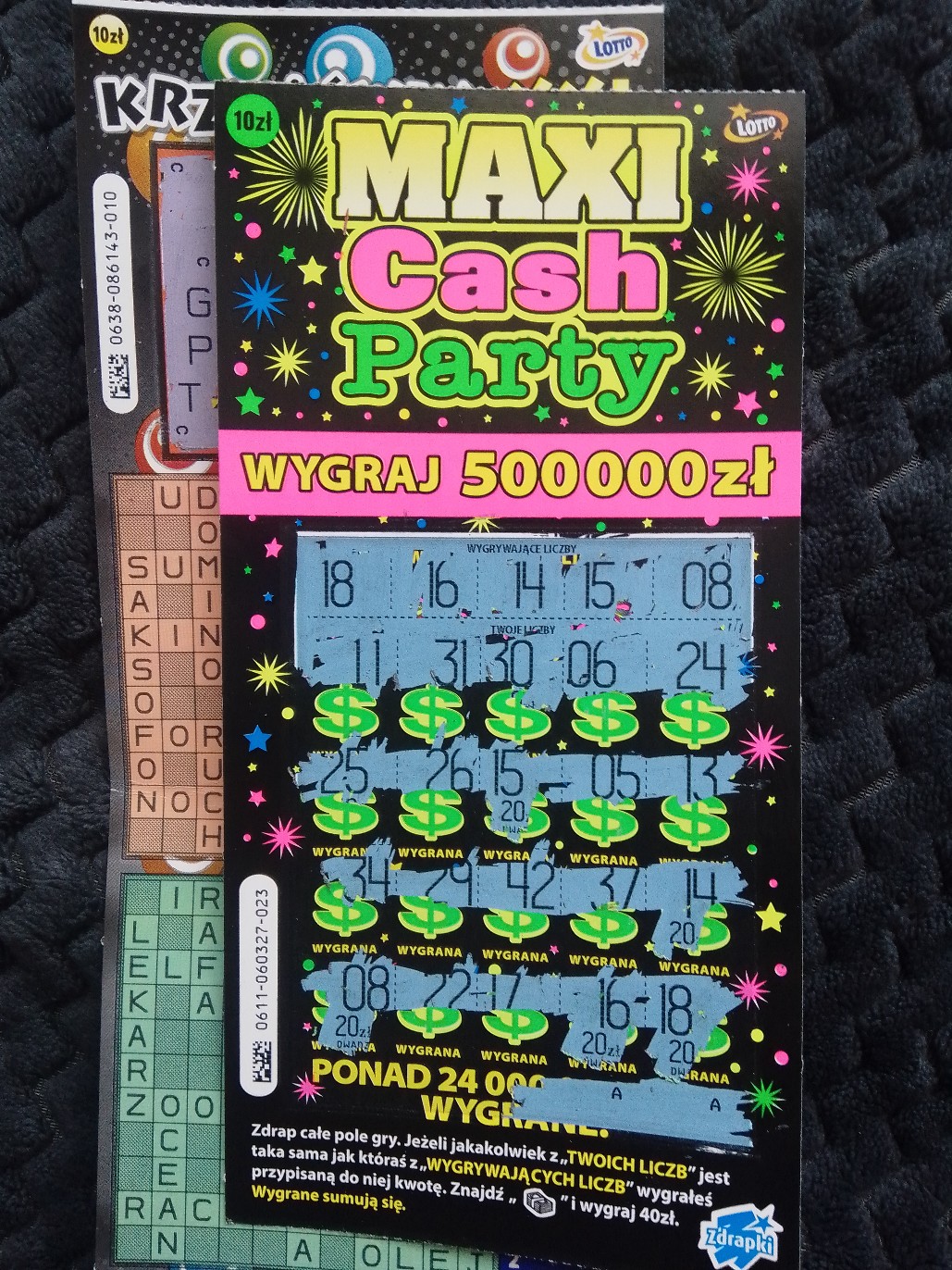 U mnie na dobre zaczęły się pojawiać paczki z bardzo niskimi numerami typu 005xxx, to też znowu ochoczo drapię maxi casha. Ostatnio wpadły jakieś drobne wygrane po 10 i 20zł, było też kilka pustaków, natomiast dzisiaj przy 1szt (013) trafiła mi się rekordowa wygrana w tej zdrapce - 100zł