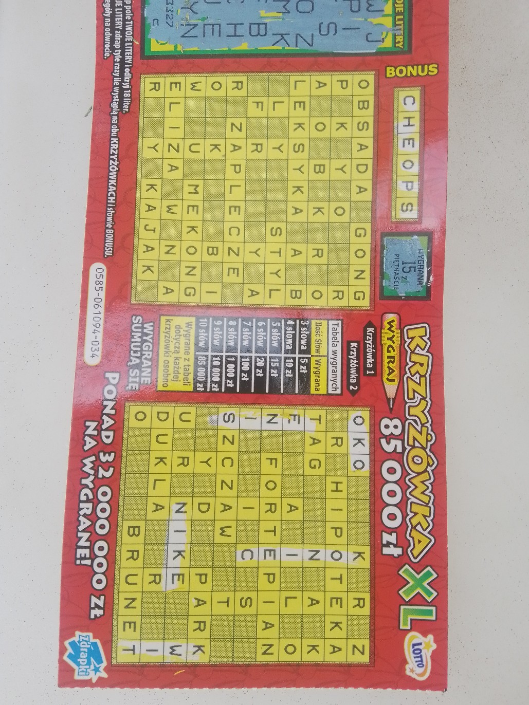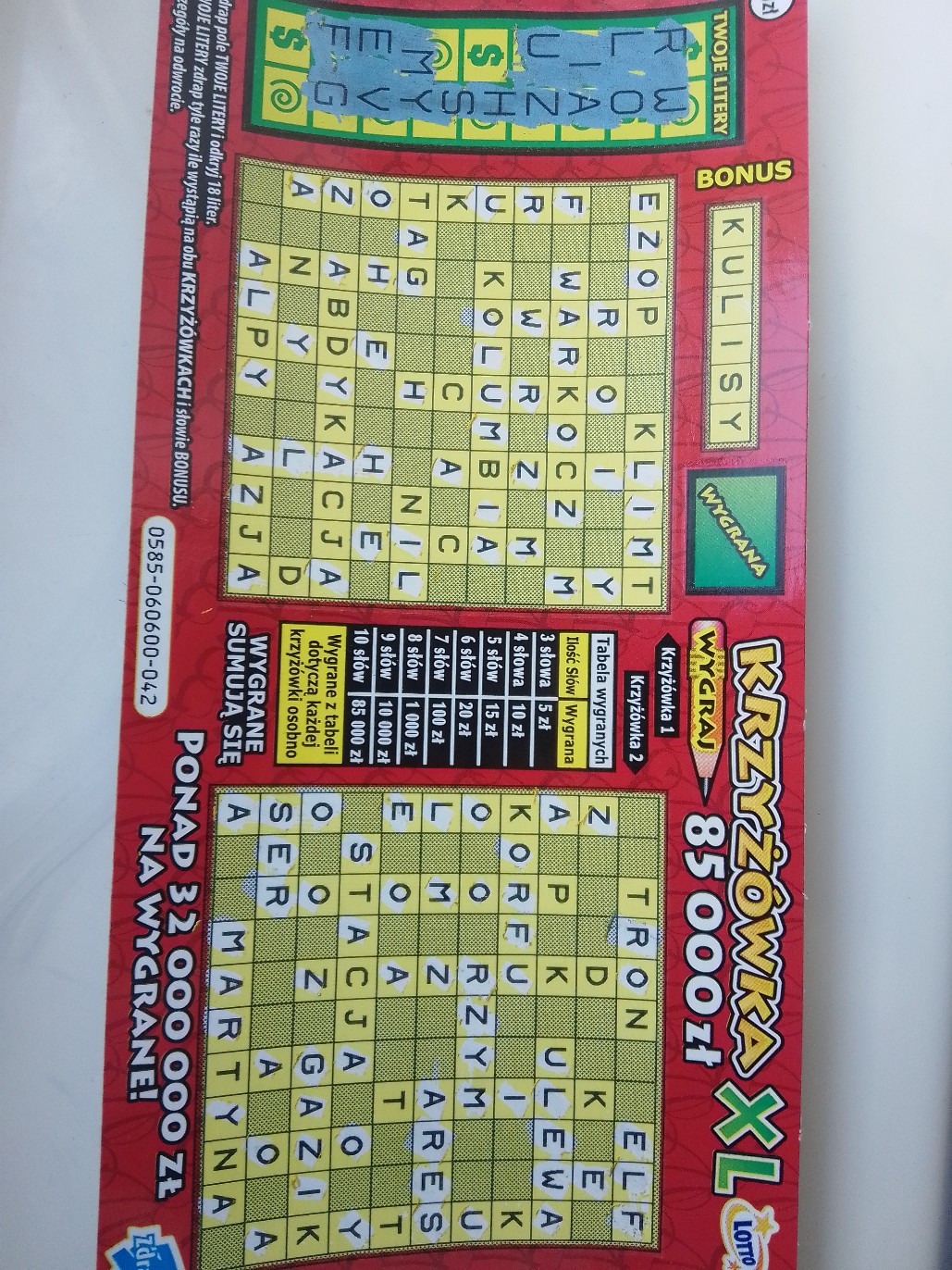 Ależ mam emocjonującą zdrapkę. Jest już 100zł, jeżeli w pozostałych dwóch nieodkrytych literach będzie K - to wyjdzie gł.wygrana