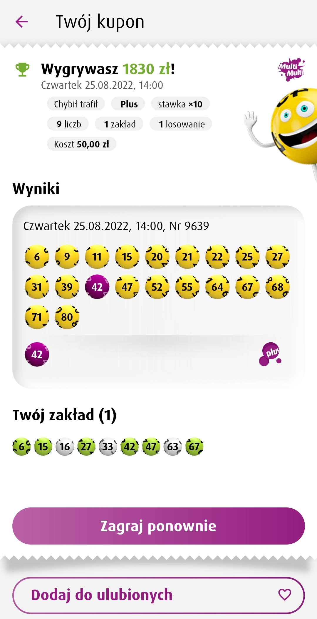 Fajnie że wygrywacie ja nadal czekam na swoją 5/5 w multi multi ale do 1.09.2022 mam kupon może wejdzie