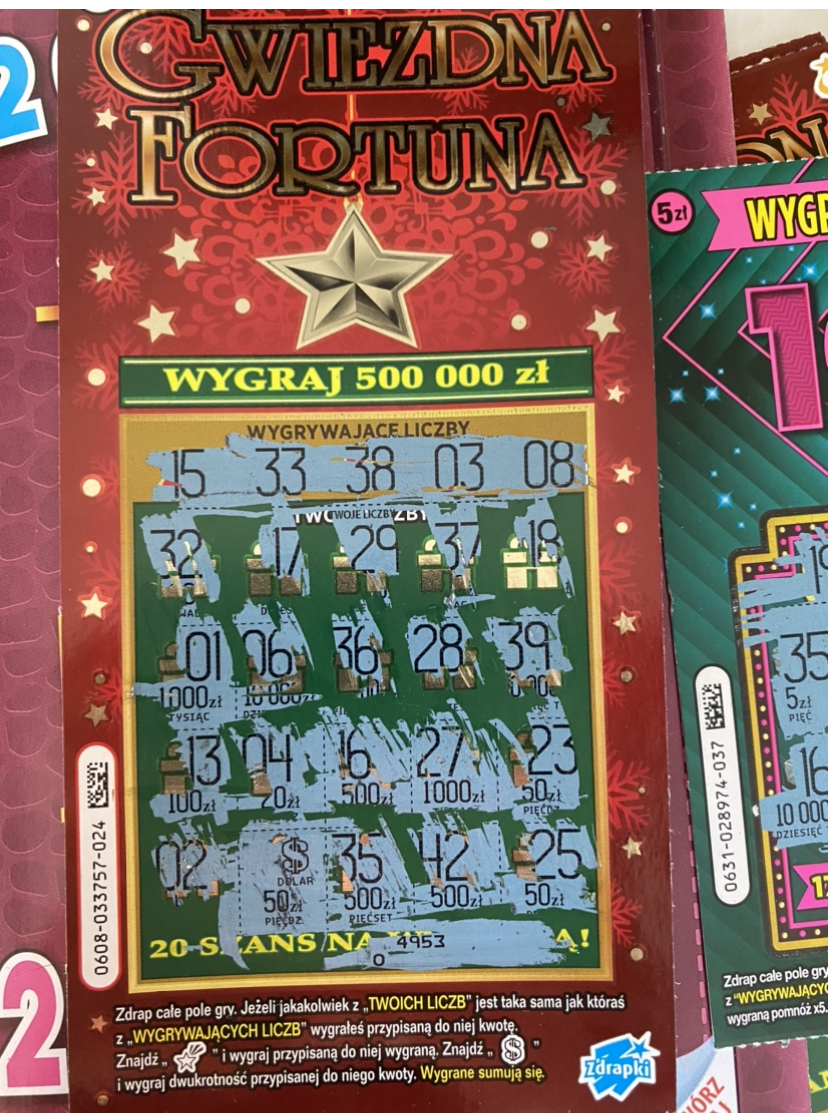 Anatra pisze: ↑11 wrz 2022, 7:44Rozbrajam paczki Gwiezdnych Fortun w różnych sklepach. Kolor czerwony, wiec może coś się znajdzie grubszego. W moim sklepie jest jeszcze kilka sztuk, wiec dziś je kupię. Mam na oku jeszcze całą paczkę w KRK, ale muszę kupić albo pół paczki albo całą ponieważ pan nie pozwala rozrywać paczekpoglądowo wrzucam trzy fotki z większa wygrana i trudną warstwą do drapania