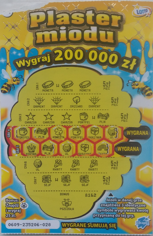 Wieczorem poszedłem jeszcze wymienić i wziąłem 10x kasa (pusta). Dałem też szansę plastrowi miodu choć to jeden z najbardziej nieszczęśliwych dla mnie losów. Ku zdziwieniu w bonusie wydrapałem pszczółkę za 25zł, szok