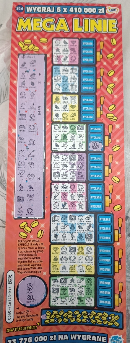 Wziąłem 2 mega linie i było 0 . Z paczki było jeszcze 5 i było 40 i 20 . Ogólnie wzięłem za 400 zdrapek i jest oprócz mega linii 110 . Pech