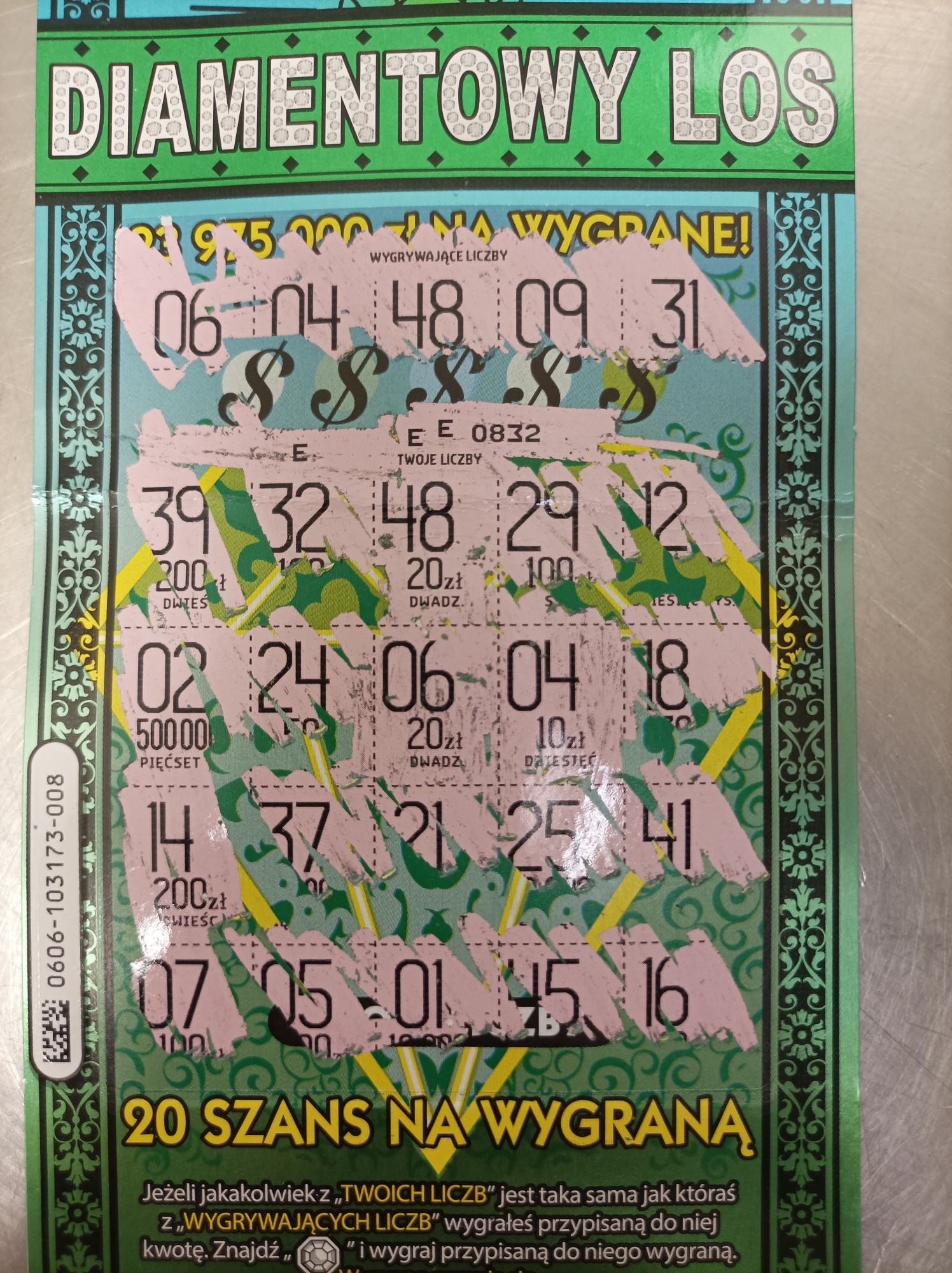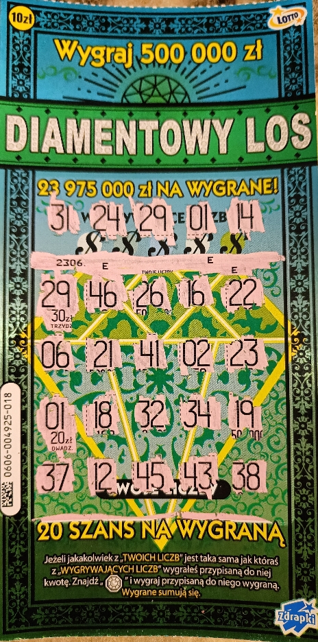 W tym dziadostwie w którym nie wygrałem więcej niż 30 zł nie ma już głównych wygranych. Kopia złotego losu, ale złoty był o wiele szczęśliwszy, a diamentowy to jedna z najgorszych zdrapek