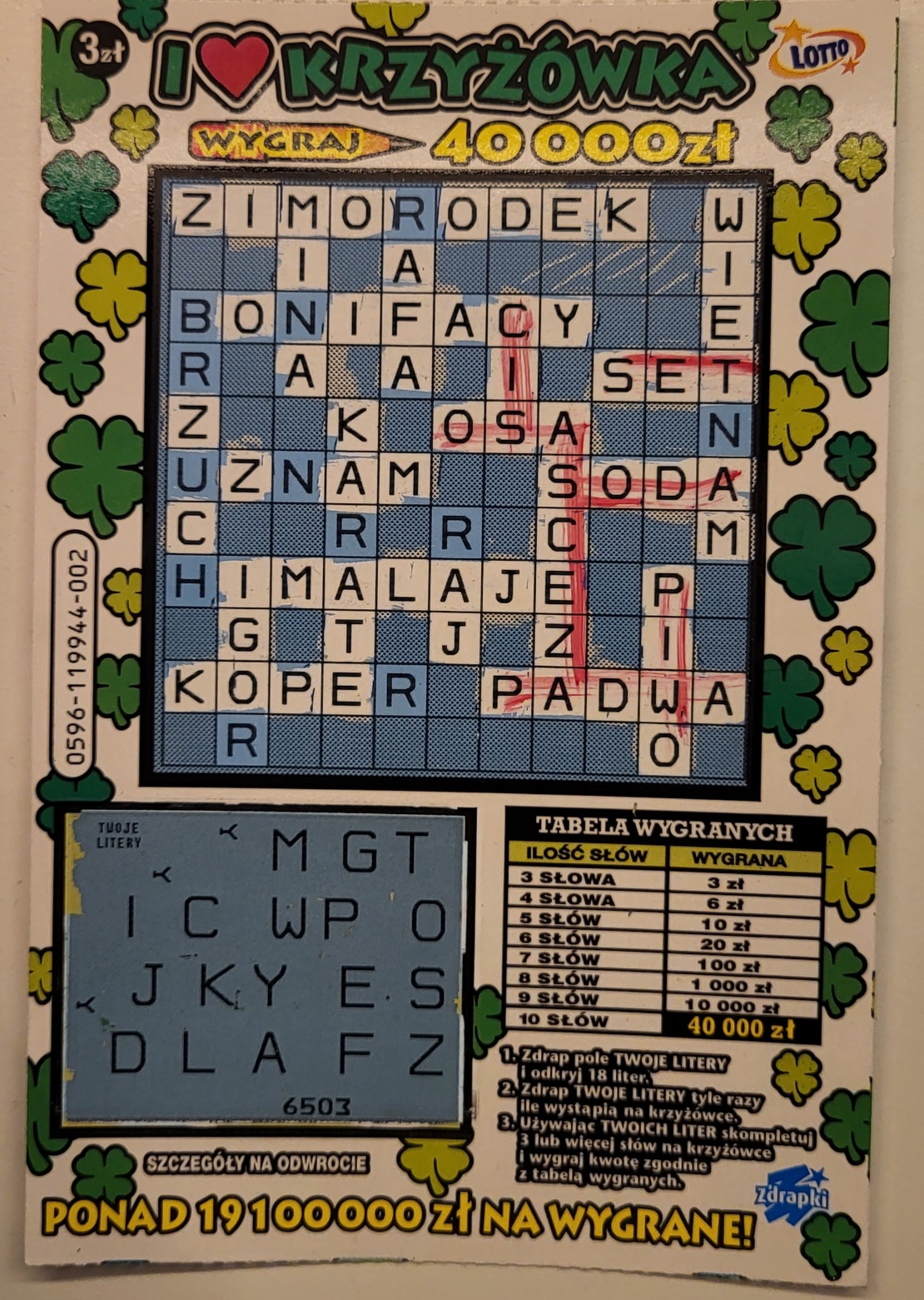 I dokończyłem wreszcie te 38 Krzyżówek i 1x20, 1x10, 3x6, 6x3 czyli 66 zeta więc w ogólnym rozliczeniu 30 zeta na plus
