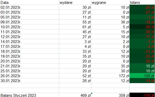 Szkoda że nie robiłem tego w styczniu kiedy trafiłem 100zl w Big777 i Krzyżówce za 3zl. Ciekawe jakby to wtedy wyglądało, ale już z pamięci nie uda mi się odtworzyć tego.