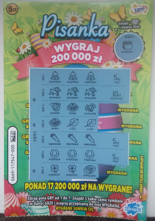 Fajnie że w tym roku będzie coś na Wielkanoc bo poprzednia taka zdrapka była w 2019 roku.... Oczywiście fajnie by było podrapać starą poczciwą pisankę za 1zł, ale nowa wersja za 5zł też jest w miarę. Formuła w sumie ta sama tylko rozszerzona do 7 szans + bonus. Na pewną będą ją drapał bo coraz mniej takich zdrapek z charakterem ;)