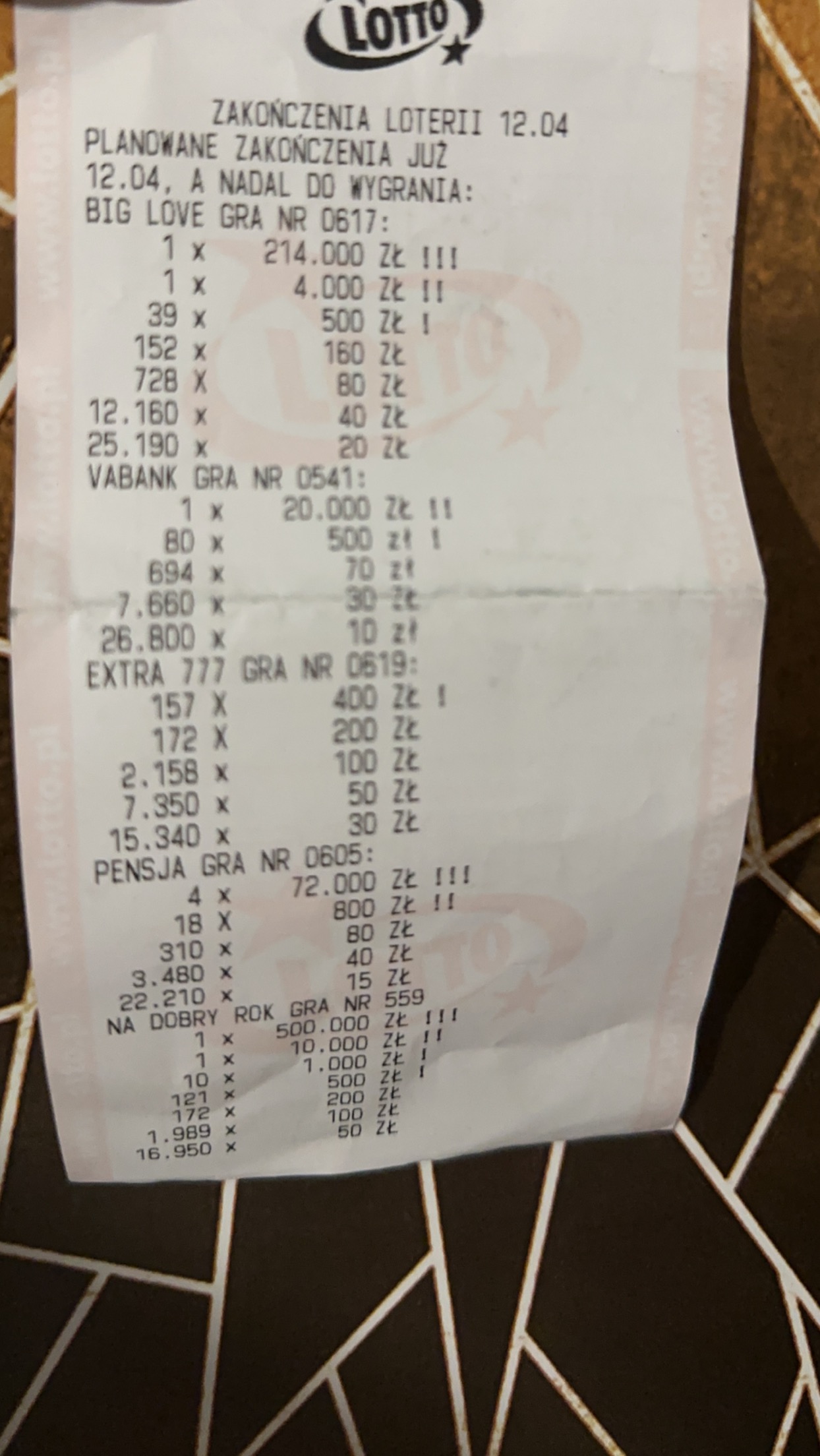 Tyle że jakieś marne paczki ostatnio trafiają w moje okolice. Najwiecej to 100 i niższe. Mogli by coś podesłać grubszegoAnatra pisze: ↑11 mar 2023, 19:59Też wolę starsze zdrapki. Nowości to tak okazjonalnie jak mnie coś najdzie. Teraz kupuje 500 w Banku i Wielką Krzyżówkę. W grze też są Mega Linie i Krzyżówka XXLsk8erboy26 pisze: ↑11 mar 2023, 19:51Wiesz, raczej chyba nie wpadnie ta główna bo bedziedzie jak z ŚO, wszyscy się najaraliśmy i lipa wyszła więc teraz wiem że lepiej to na spoko potraktować niż wydać w diabły kasy, co urobię na innych to 50% przeznaczę na NDR resztę na starocie dopóki będą, w Grubym Cashu są 2 po 10.000, EP jest godna uwagi czy Mega Pensja więc może to też poskubię