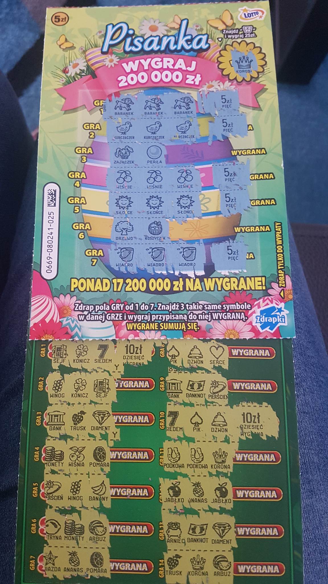 Dzięki! Widzę, że zdrapka nie jest zbyt popularna. Ja tam często dość biorę spośród tych za piątkę i dziś też los się uśmiechnął. Jedna sztuka wybrana (040) i 50 zł rozbite w układzie 3x 15 zł + 5 zł