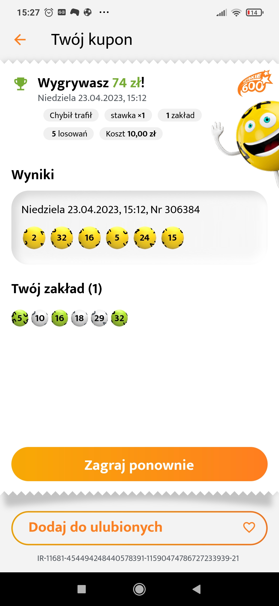 Razem 56 zł. Niestety nie udało się 5/6 wyłapać, ale i tak byłem zaskoczony, że aż tyle liczb poprawnie miałem.