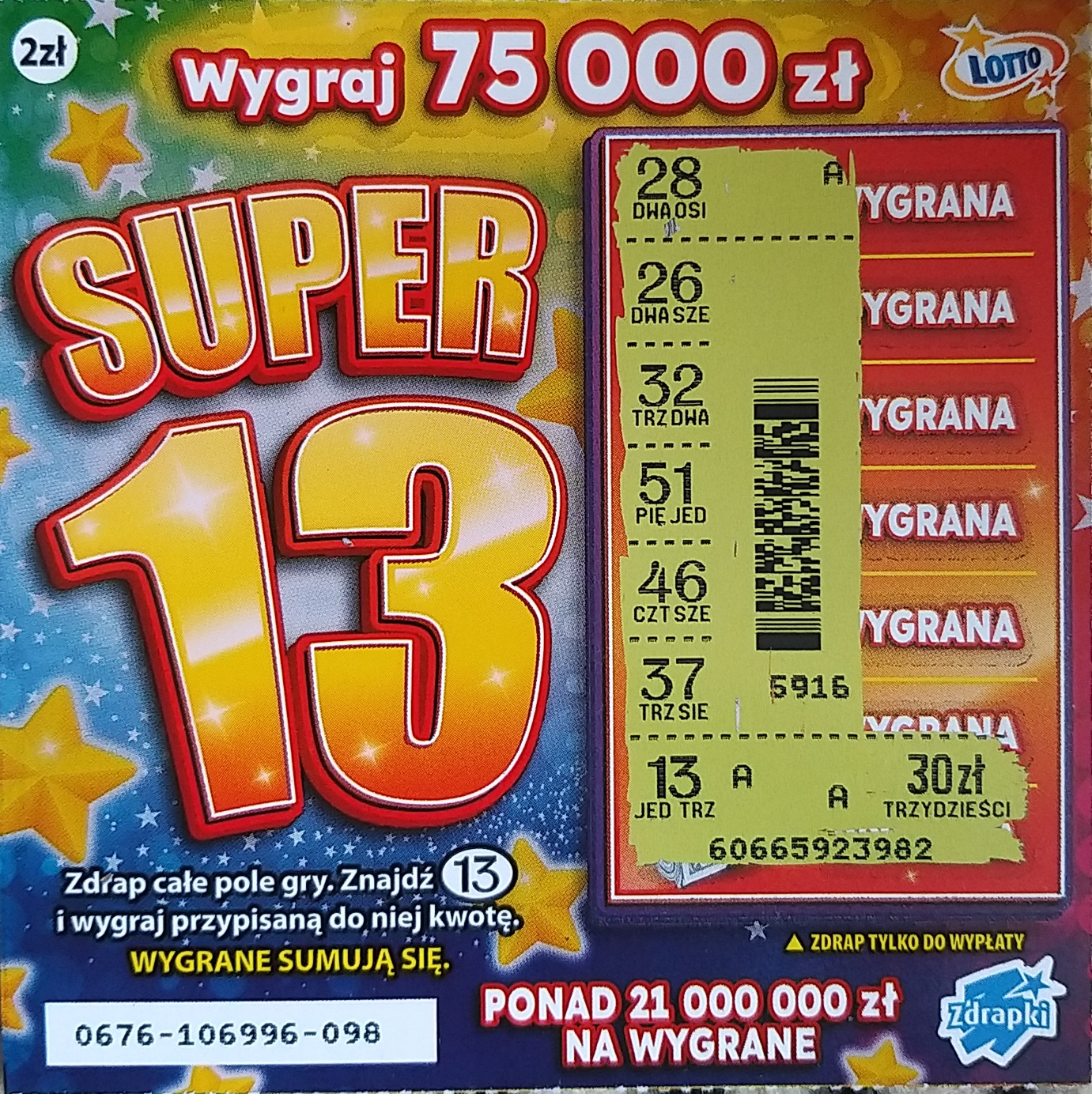 U mnie tak samo jak u grzybka. Na 5 sztuk miałlem 4 puste i jeden zwrot. Ale cóż powiem ? Mam prywatnie sentyment do liczby "13", dla mnie jest szczęśliwa. Zdrapka zdrapuje się błyskawicznie, niby jest nudna (sam narzekałem). Ale ma dobrą warstwę, żywe kolory, dla mnie będzie brana z tych za 2 zł obok Super 7 (Pensji nie widuję u siebie). Nawet jak jest cienka, ona mi się jakoś podoba : P