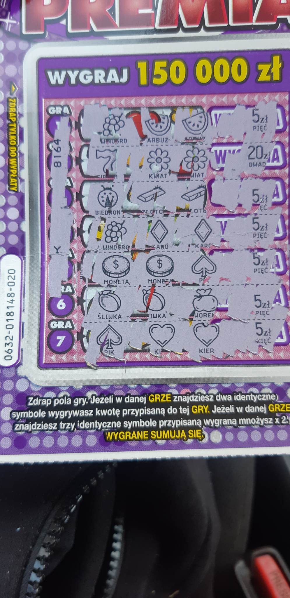 Dzisiaj kupione 7 premii i było 1x20, 1x5. Ciężko będzie się przebić w tej zdrapce żeby trafić cokolwiek wartego uwagi, przeważnie same drobne do 20zł wlatują.