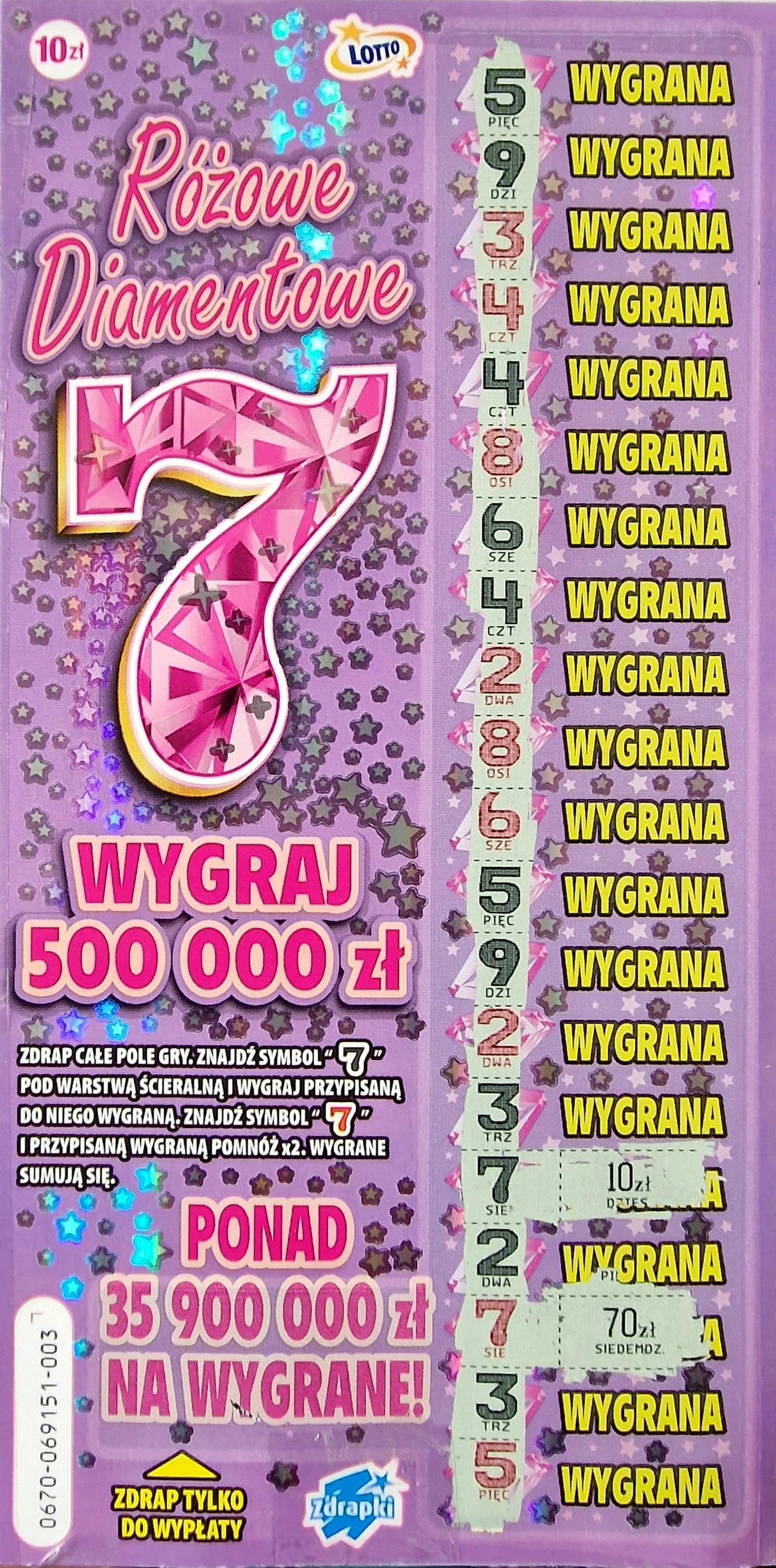 Graty. Prawdę powiedziawszy nie wiedziałem że w niej można trafić taką wygraną. Czasem kupuję ją- bo ma tyle 500tek co magnetyczne5. A w magnetycznym5 wisi u mnie w różnych budach z 8 po 500 - a w tej ani jedna. Miałem 3*70,3*50 i drobne i nigdy czerwonej 7ki