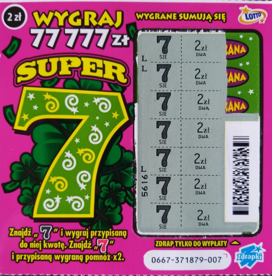 Nie kupuję już zdrapek od lat, ale za czasów kiedy kupowałem "Super 7" było częstym moim wyborem, jednak więcej niż 2 x 77 zł nie miałem (raz nawet przy zakupie 1 sztuki).