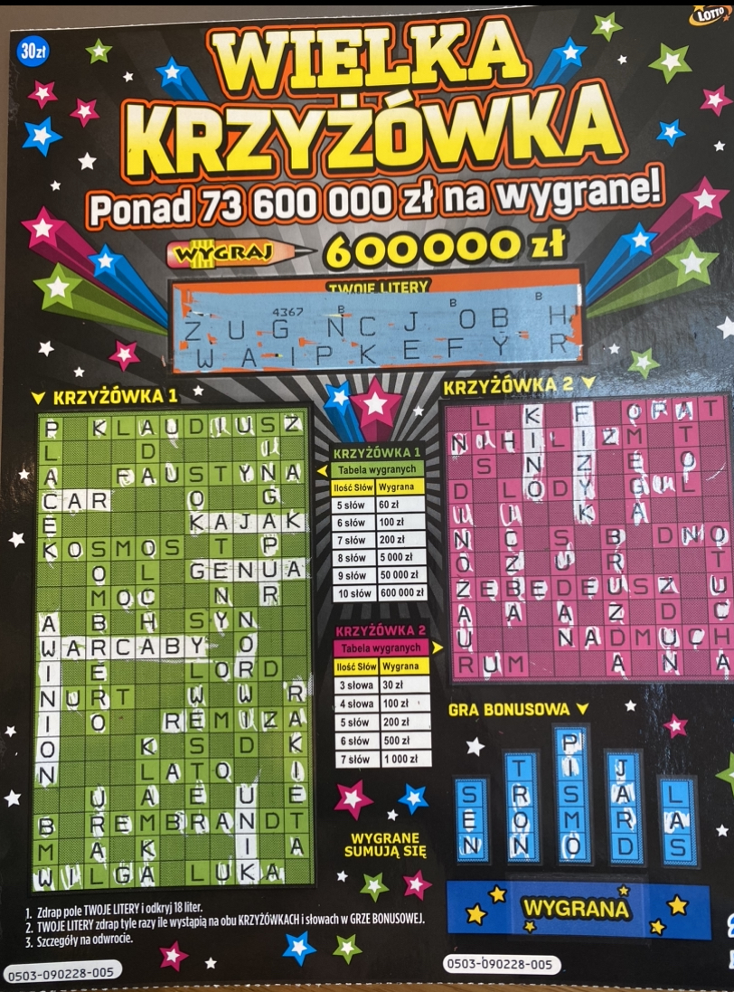 Dziś trochę pochodziłem po mieście za Premią oraz Zieloną Pensją i w jednym punkcie, gdzie miałem przy okazji ponownie sprawdzić dostępność WK, okazało się, że pani tym razem ma. Wybrałem z kilku dostępnych sztuk numer 008 i trafiło się 100 zł, właśnie VOX był na pierwszej krzyżówce i tam mi się ułożyło 6 słów. Z kolei w punkcie, gdzie jakiś czas temu była wysoka dostępność, sprzedało się wszystko.