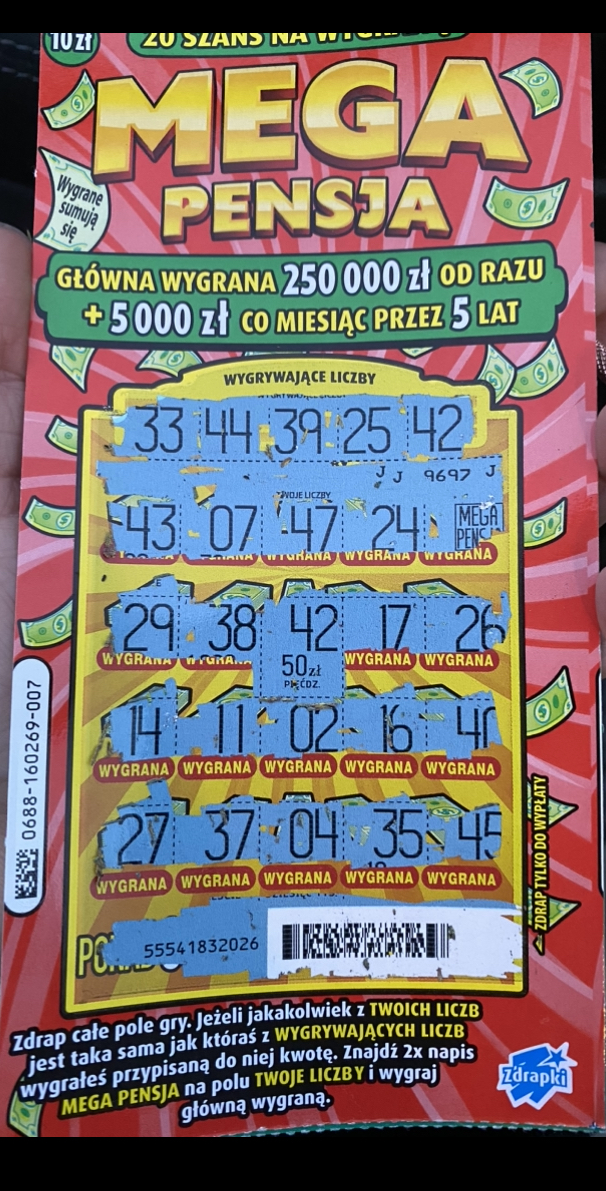 Ale kilka tygodni temu mi się śniło, że w długiej czerwonej zdrapce wygrałem 10 tysięcy pod numerem 22 więc chyba będę ją męczył, żeby połudzić się trochę