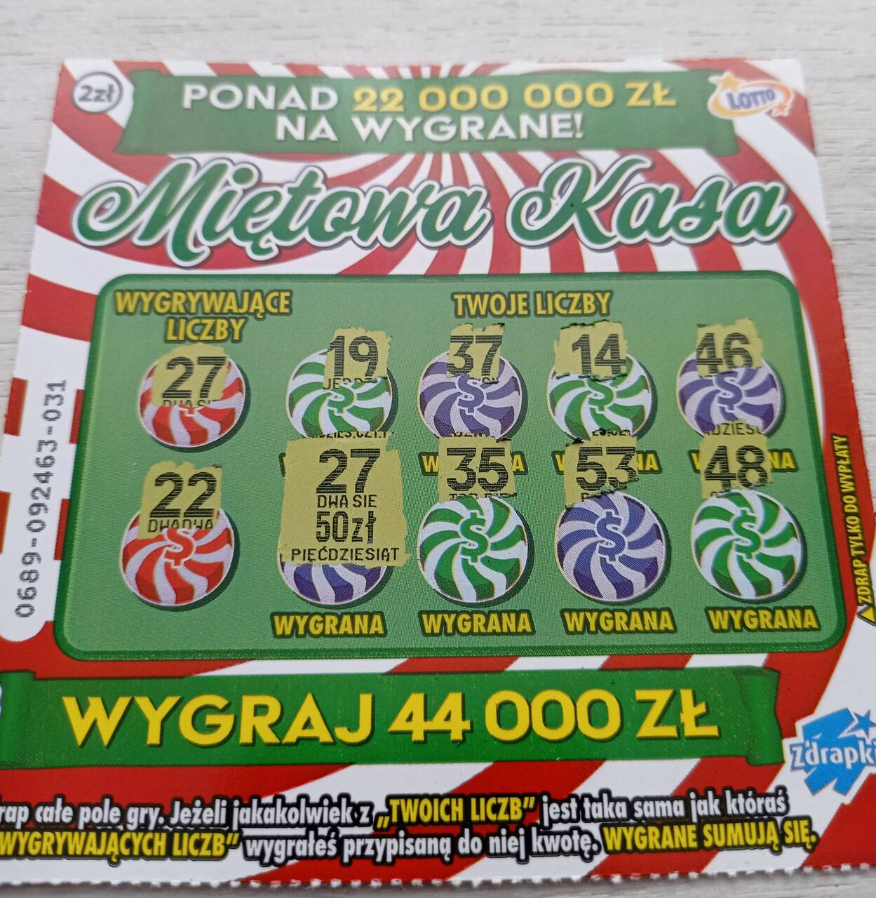 No ja polowałem na 50 w kotach, niestety się nie udało ale 20-tek miałem bardzo dużo. W kotach trochę w oczy biło to że zasady gry totalnie nie miały nic wspólnego z grafiką, nazwą losu i jeszcze takie malutkie liczby. Miętową drapie mi się trochę lepiej ale mimo to zdrapka nudna