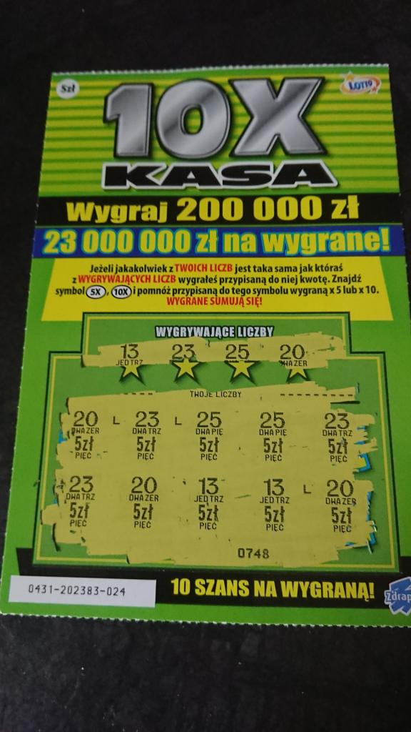 Ze wszystkich zdrapek w tym roku najszczęśliwsza dla mnie. Ostatnio coś przystopowało, ale 10 mam częściej niż 5 i zwrot. Dziś dwie sztuki - jedna pusta z nr 28, druga 10 zł pod nr 50.