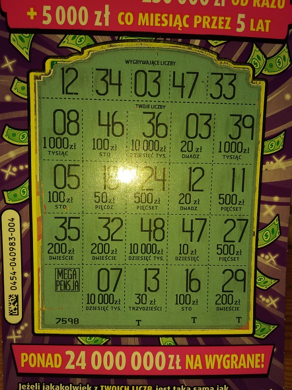 Wczoraj w pracy zdrapałem Mega Pensję żółtą i miałem 200zł, każde pole po 10zł