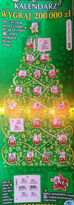 Dzisiaj w mojej kolekturze ekspedientka sprzedała mi info, że ktoś niedawno wydrapał u niej 10000zł w świątecznym kalendarzu, aż żałuję, że nie widziałem tej radości szczęśliwca:)