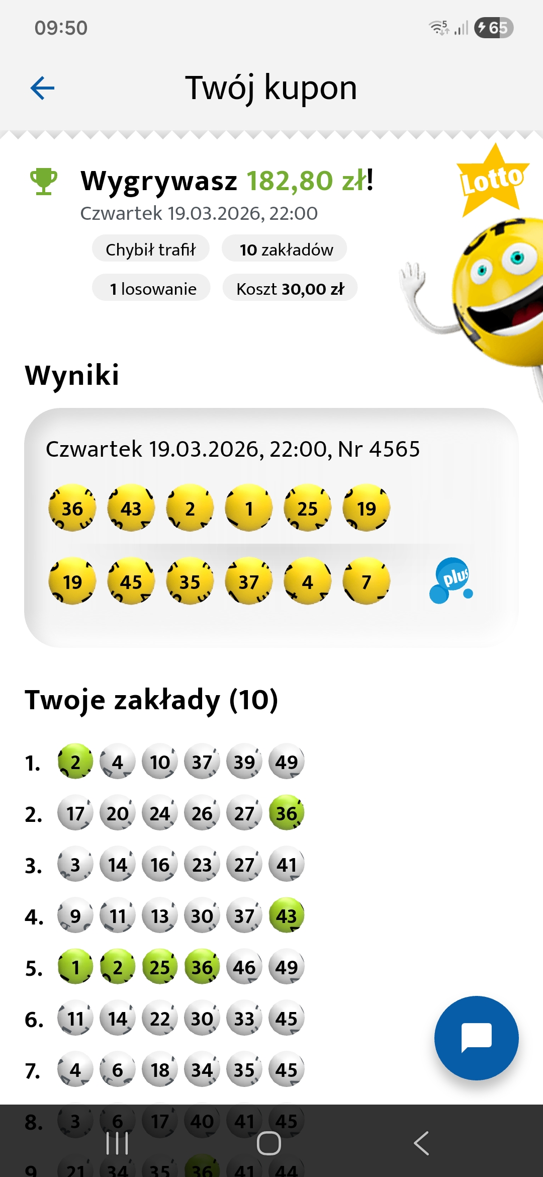Zagrałem tylko ze względu na kumulację więc dobrze że coś wpadło, będzie na sobotę