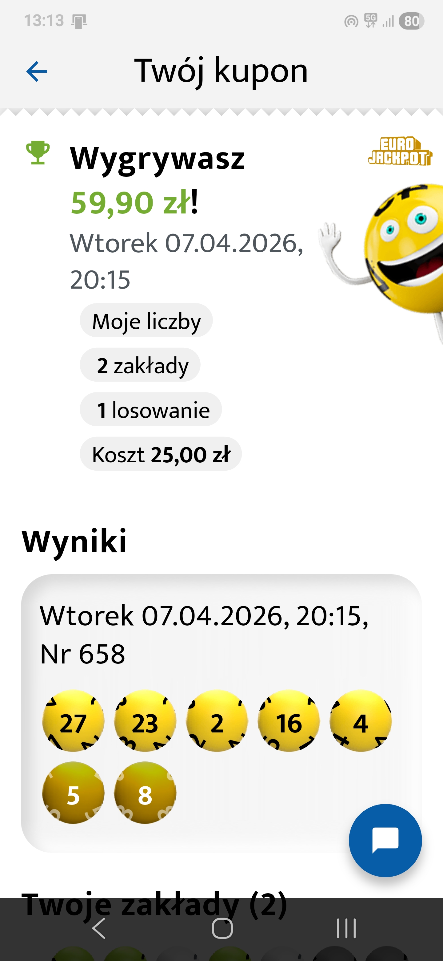 Najgorzej to i tak trafić 4+2 bo możesz wygrać np. 20k albo 500k. Nie dość, że musisz trafić kombinacje 4+2 to jeszcze musisz liczyć na to że nie padło 5+0, 5+1 i głównanewużytkownik pisze: 27 lut 2026, 22:27 - TS-ie, trafiłem 3/5 bez dodatkowej...