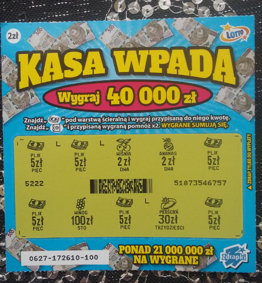 Z racji niskiej ceny losu wziąłem sobie 15 sztuk i wygrałem: 1x30zł, 3x2zł. I mimo fajnego wyniku nie będę jej kupował :P