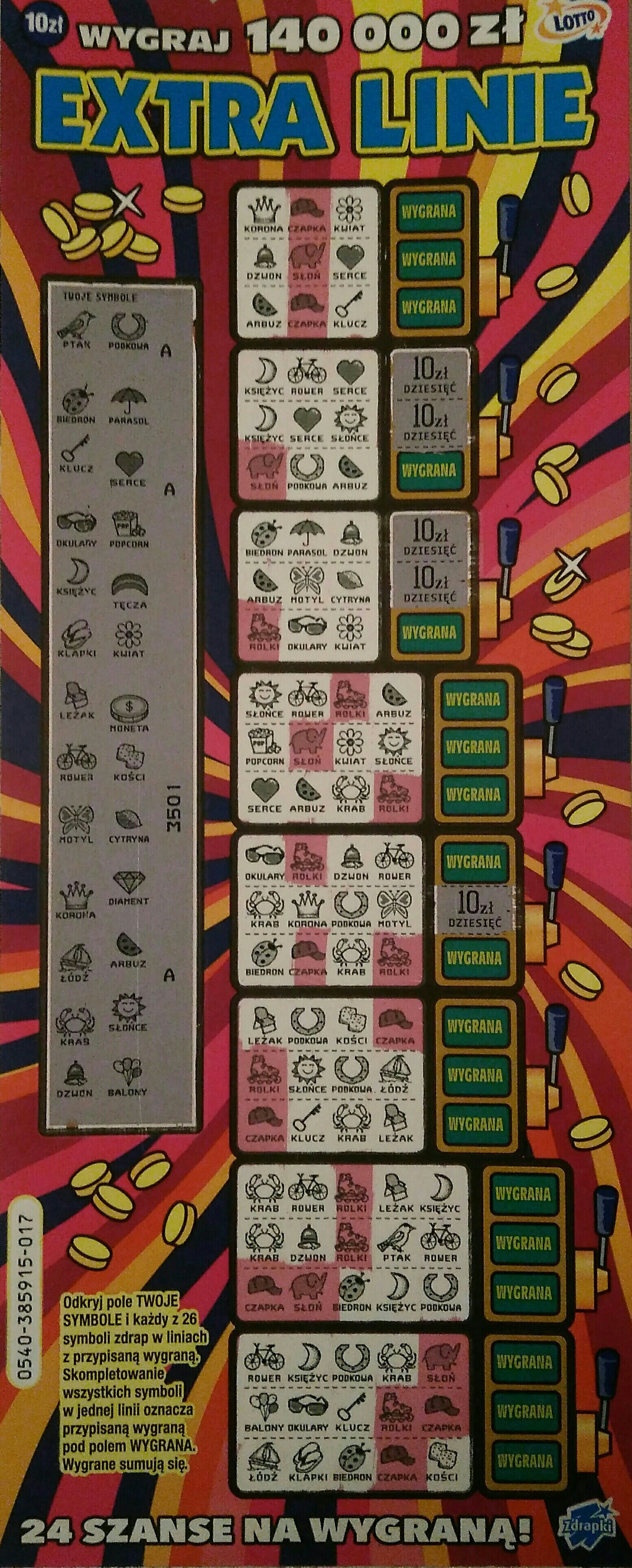Wziąłem 3 sztuki, 4, 12 i 13. Wszystkie puste. Nie lubię tej zdrapki. Najlepsze są linie za 5, mimo, że 75 nie mogę trafić