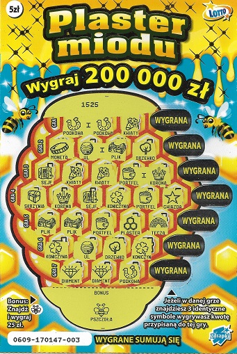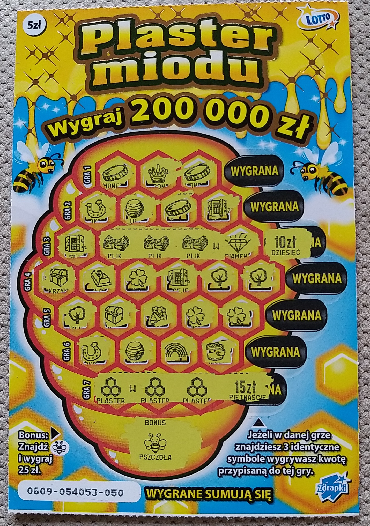 Wieczorem poszedłem jeszcze wymienić i wziąłem 10x kasa (pusta). Dałem też szansę plastrowi miodu choć to jeden z najbardziej nieszczęśliwych dla mnie losów. Ku zdziwieniu w bonusie wydrapałem pszczółkę za 25zł, szok