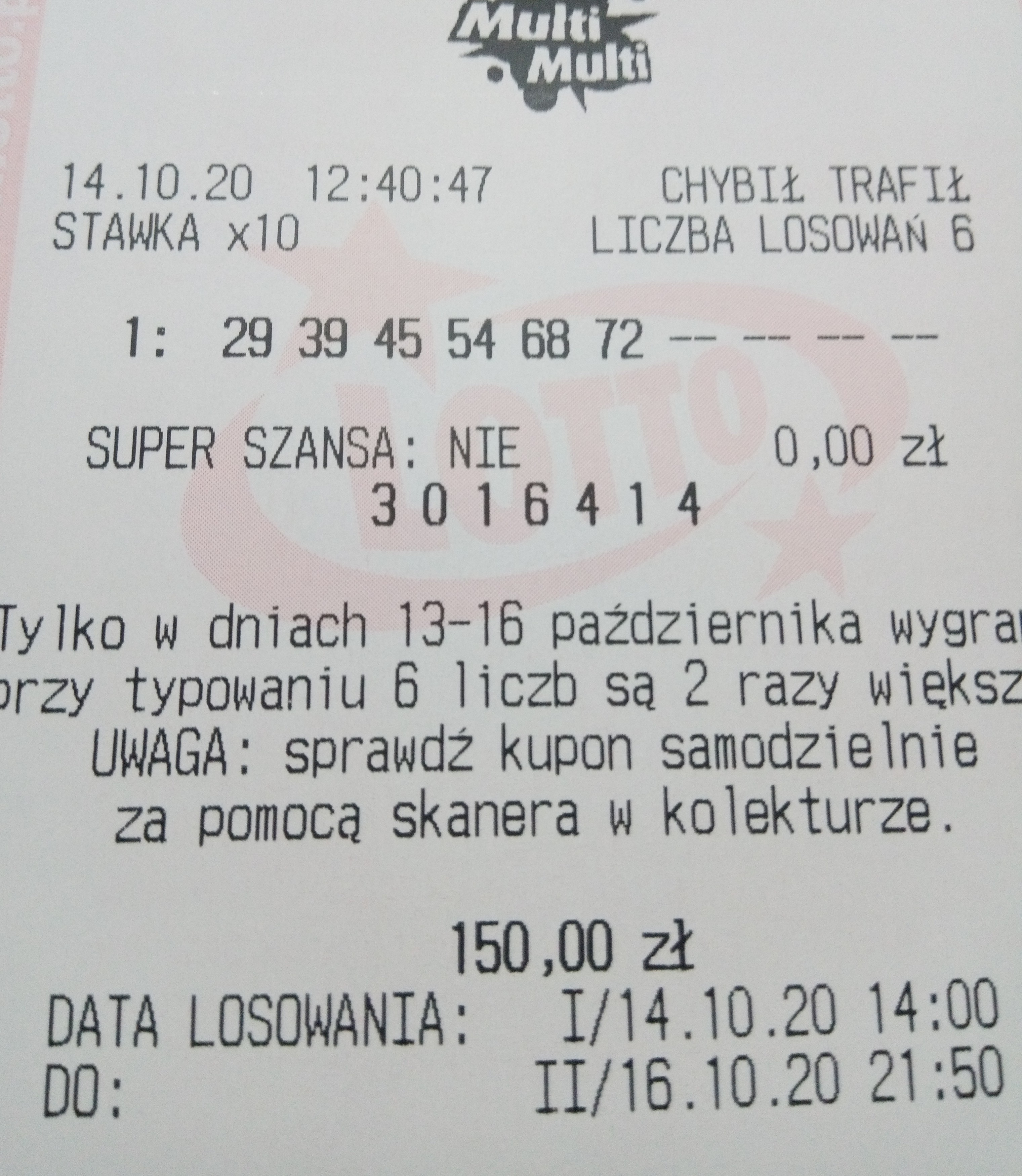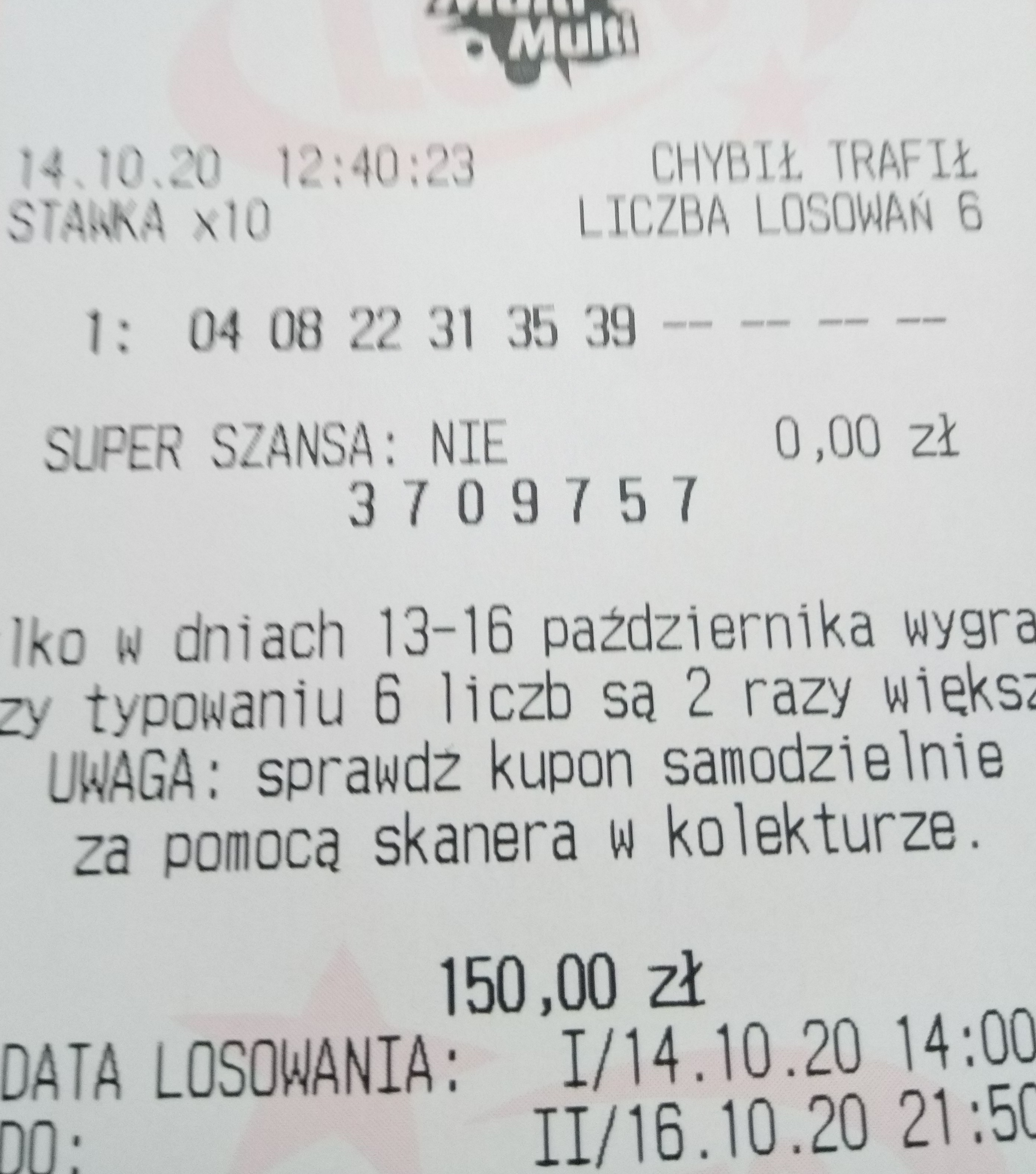 Tak by było gdybym miał 10 kuponów z tym zakładem a ja mam jeden ze stawką 10,zresztą nie ma co dyskutować z faktami, dostałem karteczkę z lottomatu że gratulują wygranej i zapraszają do oddziału.