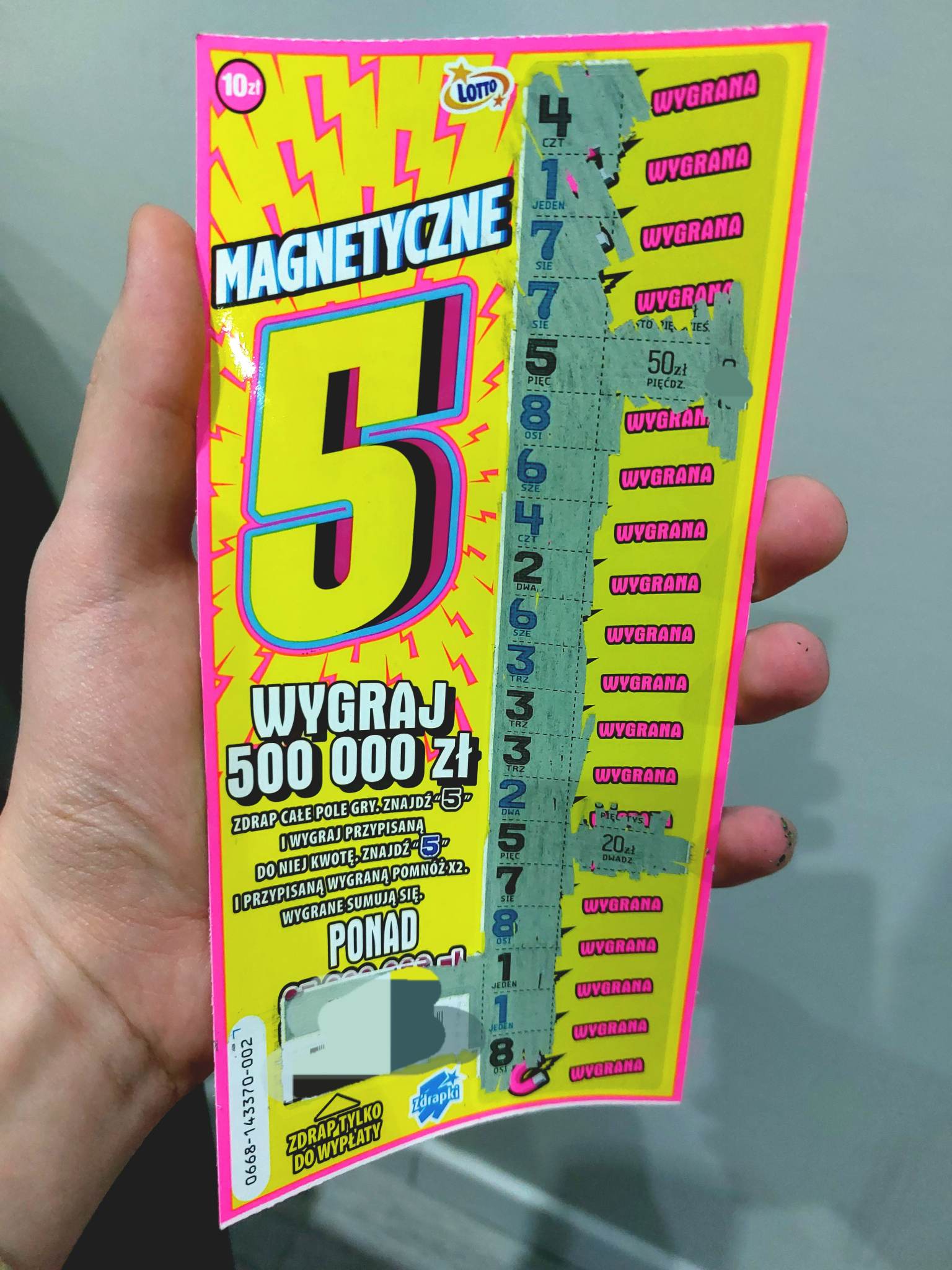 Jak nie kupuje od dłuższego czadu zdapek to wczoraj mnie cos podkusiło i wziąłem na próbę tą Magnetyczna 5 i w numerze 004 trafiło się 50 zł. Wypłaciłem od razu i w innej kolekturze wziąłem raz jeszcze ten sam numer i wpadło 20 zł.
