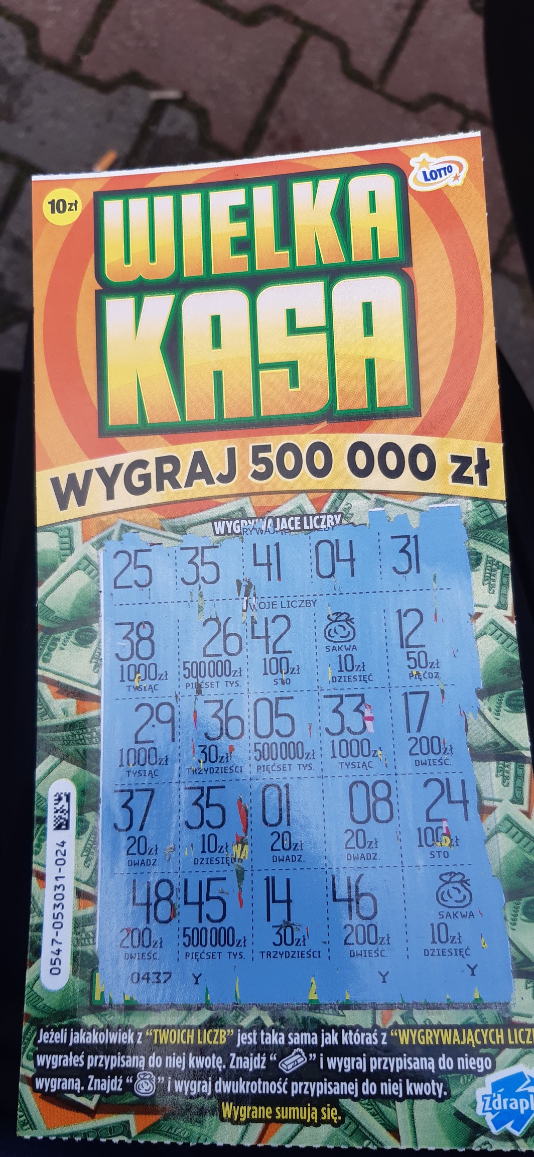 Wczoraj jedna sztuka ze zdrapkomatu z nr 015 i ukazał się worek, a pod nim dycha, czyli 20 zeta