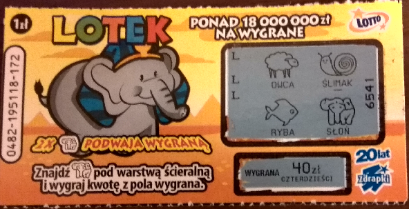 Zrządzenie losu chciało ,że szukając drobnych do maszyny z chęcią zakupu zdrapki za 5zł miałem tylko 3x2zł. I padło ,że za złotówkę wybiorę słonika bo to najlepszy wybór za tą kwotę. No i się bardzo opłaciło. Do tego Podwójna gra którą kupiłem dała 20zł :)