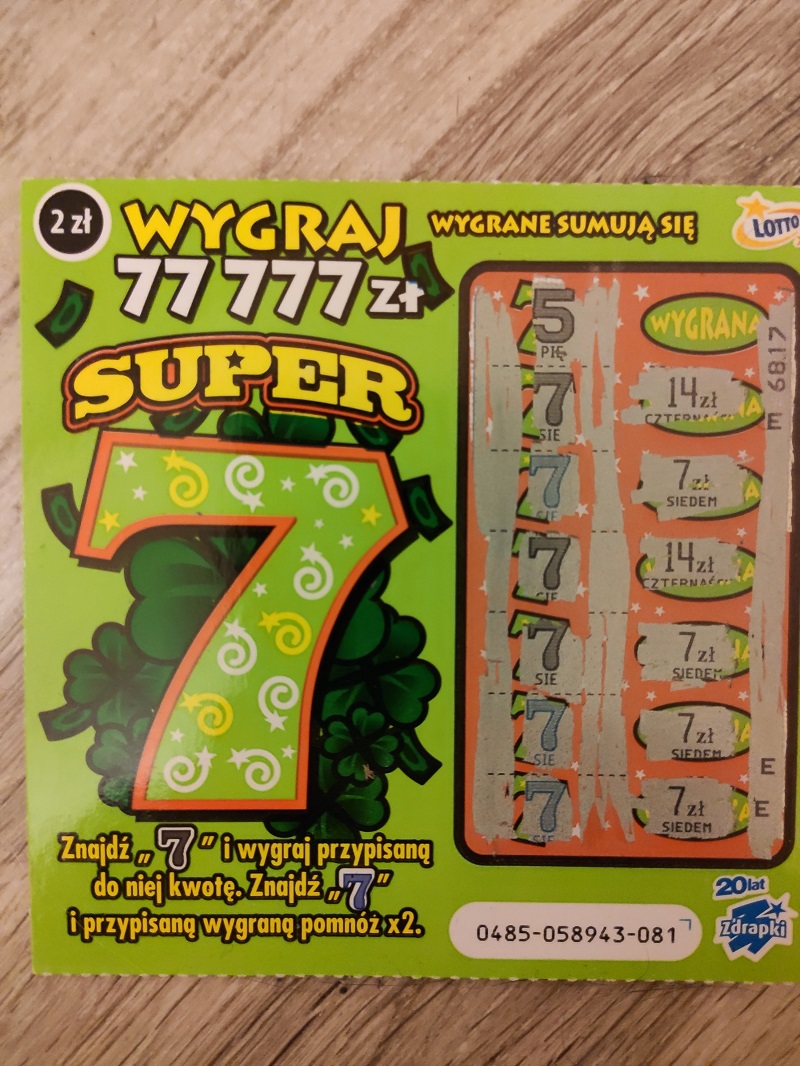 Kupiłam tylko jedną sztukę z paczki i od razu 14 zł trafiłam więc kolejna paczka na plus. Rozpracowuje teraz następną paczkę super 7 , kupuję po 2 sztuki.