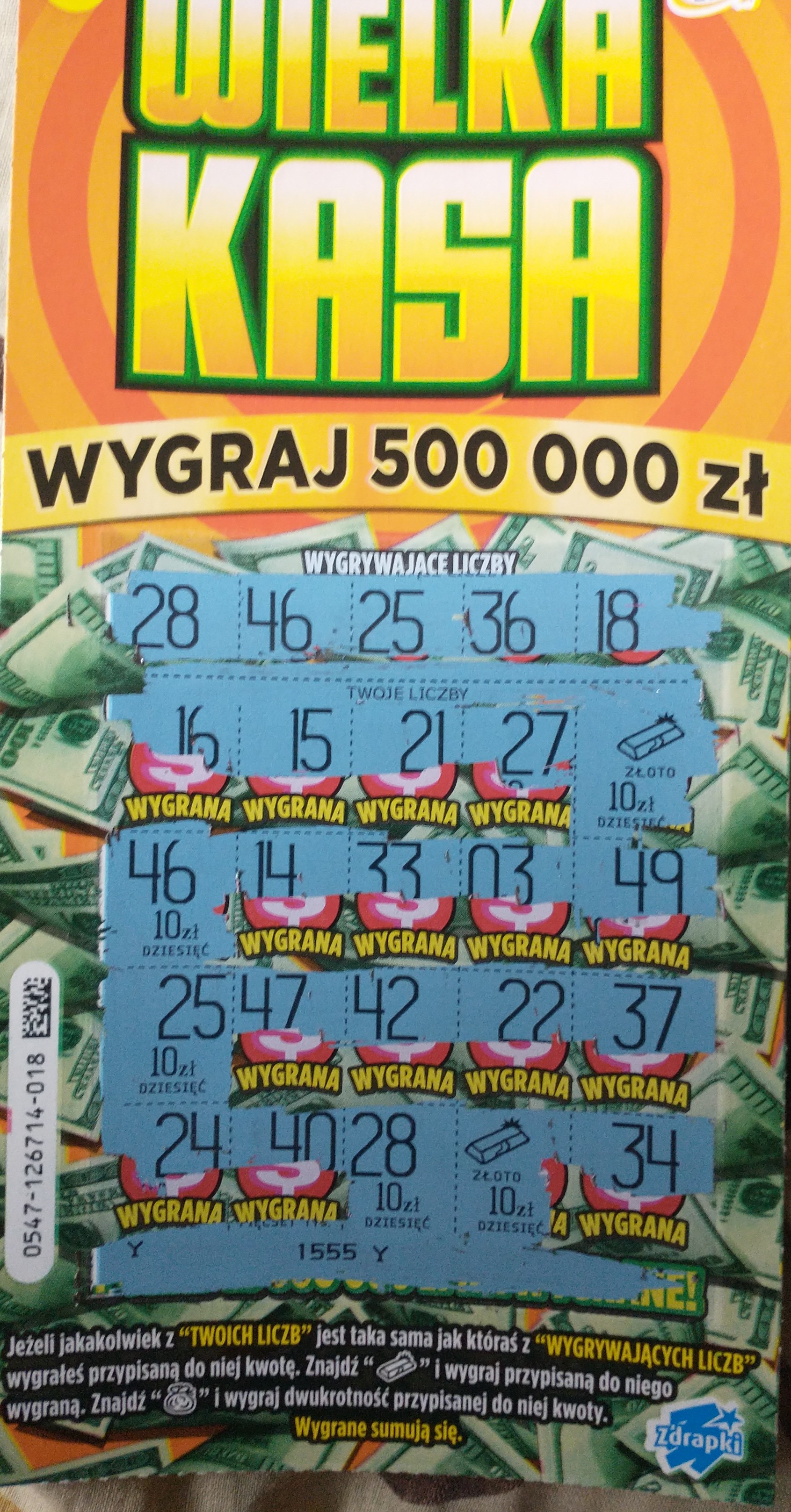 Dziś kupując Wielką Kasę i 500 tyś w banku Pani otwierała nowe paczki i pytała jaki numerek więc wzięłam 23 w jednej i drugiej. 500 tyś puste a w Wielkiej Kasie 100 zł