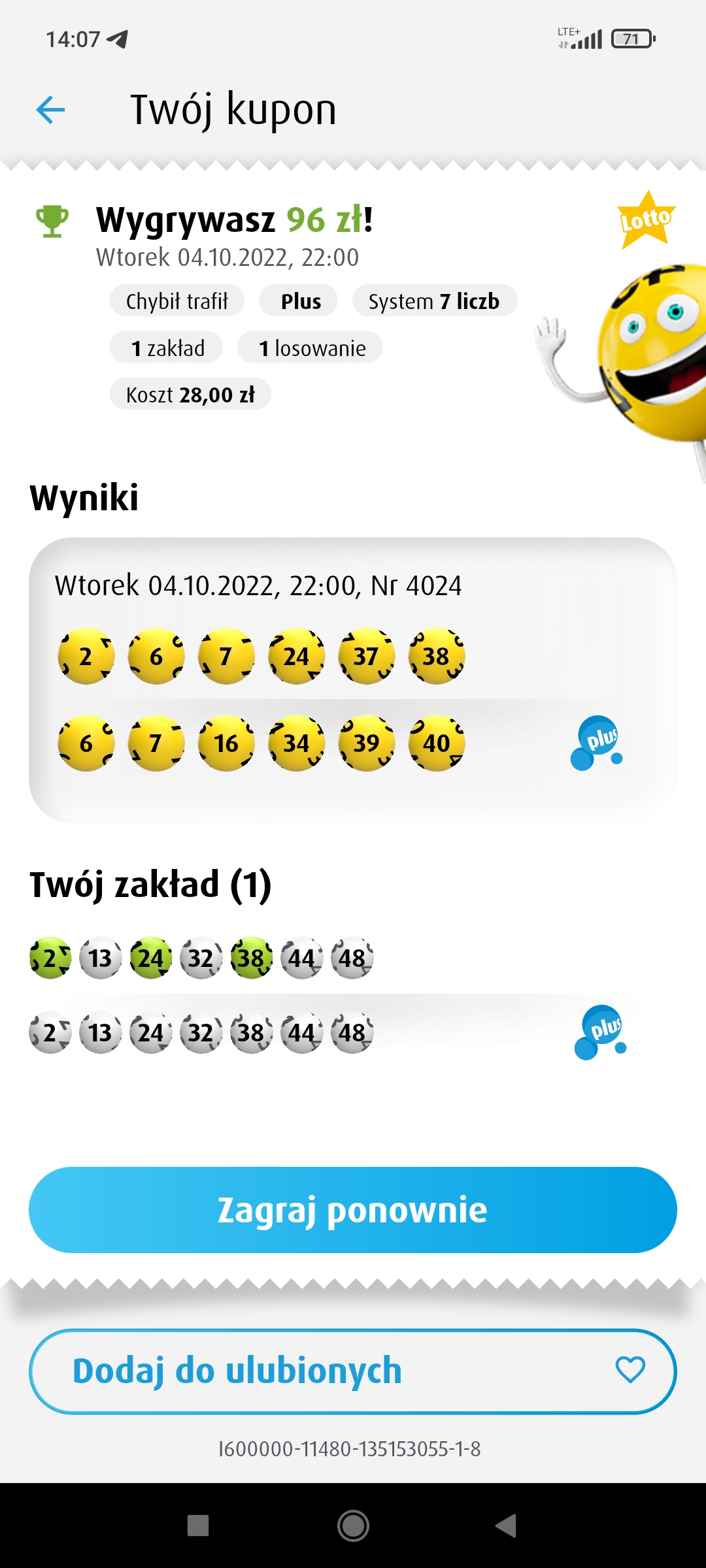 Ten miesiąc jest dla mnie szcześliwy w Plusa, miałem 1x5 i 5x4. Dzisaj wpadło 3x4 i 5x3.