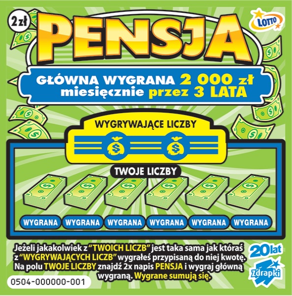 Pensja, od zawsze mi się podobała główna wygrana w tej zdrapce. Koszt ledwo 2 zł a szansa na 72 koła