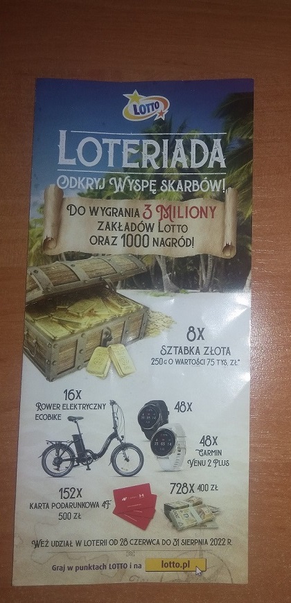 Jako, że w poprzednim roku udało mi się wygrać kartę do 4F na 400 zł, to w tym roku też przyatakuję Loteriadę. Rejestracja tych kuponów nie stanowi dla mnie takiego wielkiego wysiłku, a faktycznie można coś tam wygrać więc będę próbował znowu.