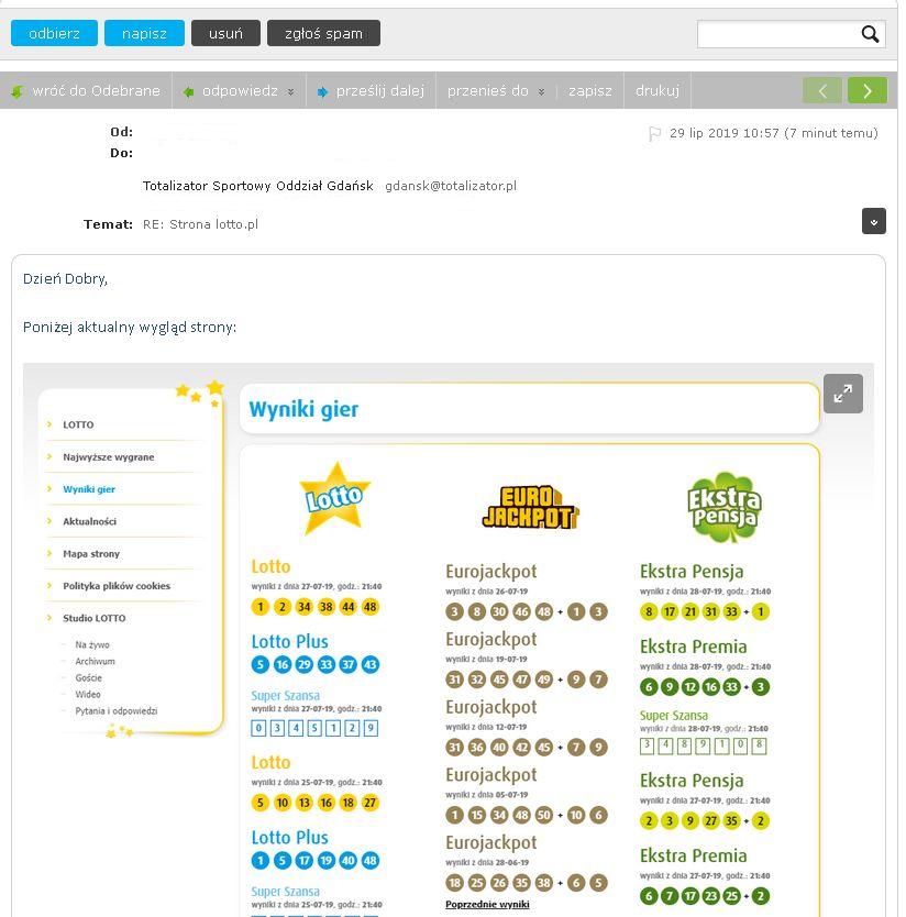 Ponadto otrzymałam dzisiaj emaila od Kierownika Regionu Sprzedaży, który to potwierdził i również przesłał screena jednej z podstron lotto.pl