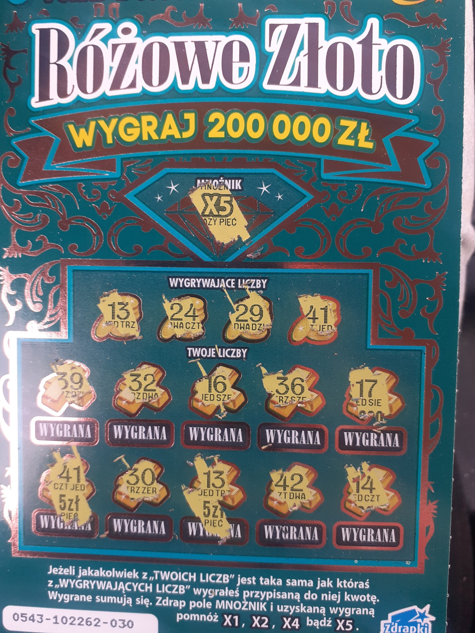 Wziąłem jedną sztukę na próbę i trafiłem 5 zł, szkoda, że literka kontrolna była umieszczona tam gdzie pole wygrywające liczby.