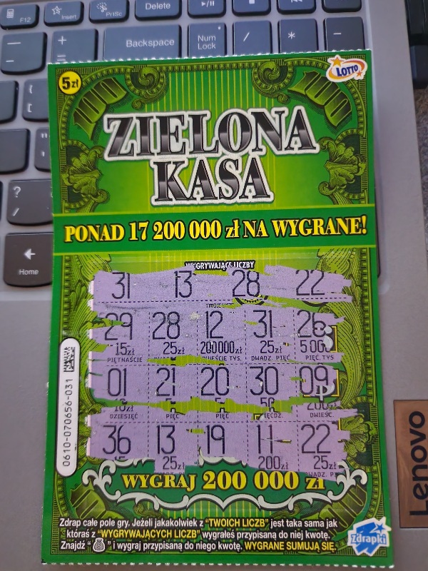 Ktoś na fb wstawiał zdjęcie wygranej zdrapki 5k (10x 500 zł) więc zachęcony wziąłem dziś jedną sztukę (016) bez specjalnych oczekiwań. O dziwo wpadło 50 zł w zdrapce nr 016 w ciekawym układzie: 3x 10 zł, 1x 15 zł i 1x 5 zł.