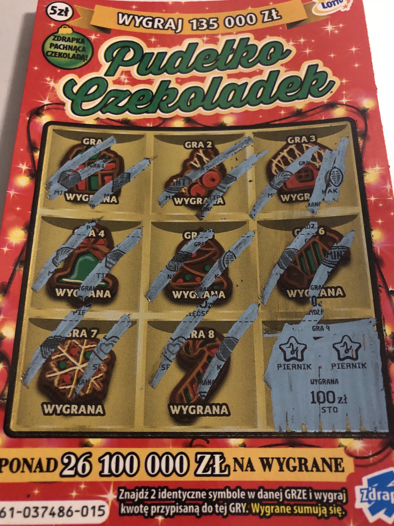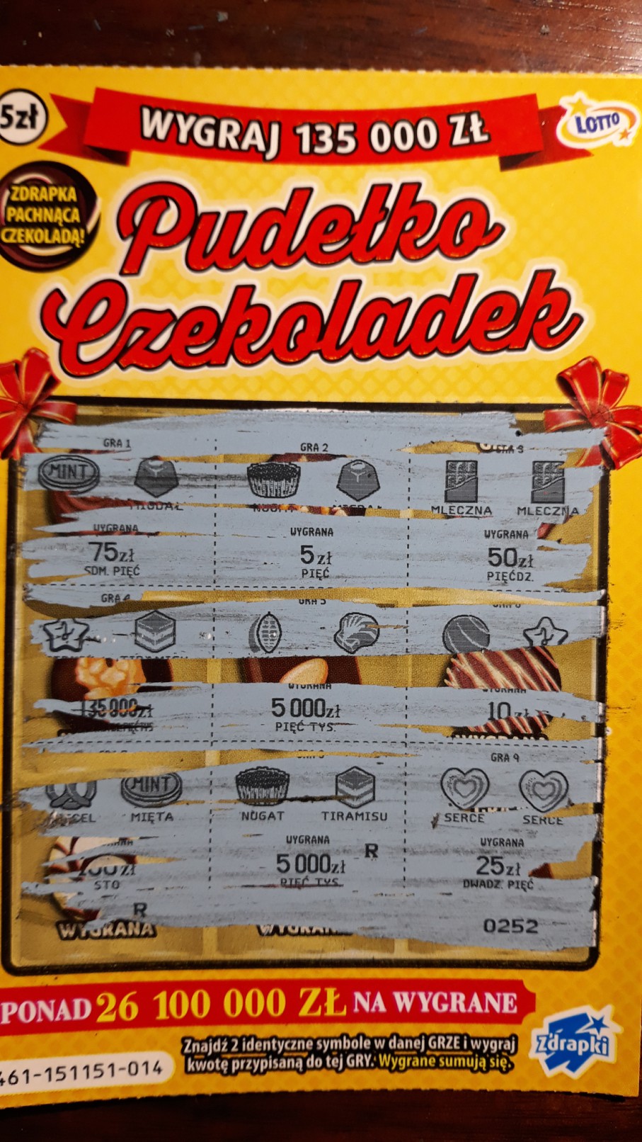 No naprawdę, do czego to doszło. Trzeba brać zdrapki, za którymi się nie przepada. Wzięłam z automatu na centralnym 2 pudełka czekoladek żeby nie powtarzać zdrapek w które wygrałam przedwczoraj i wczoraj bo pani obsługujaca mówi, że ruch zerowy. A tu miłe zaskoczenie. Drapanie oczywiście ciężkie i cuchnące z lekka. Wypadło 13 i 14. W 13 - 5zł a w 14 - 75zł.