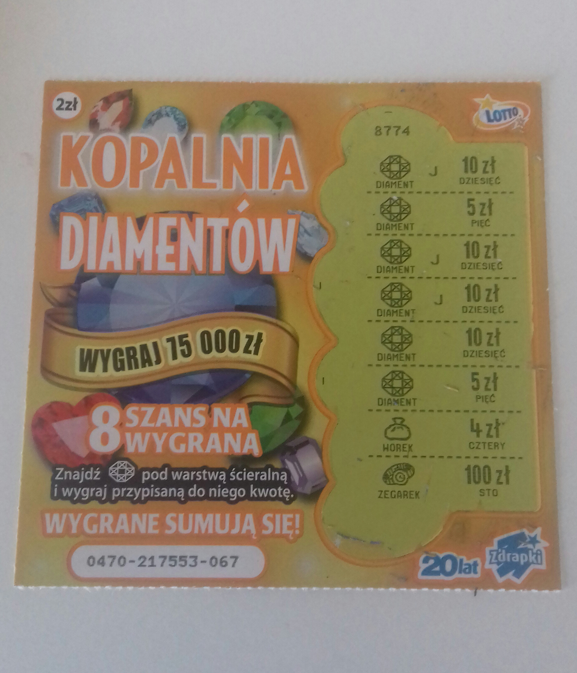 Fajnie, brawo ! 50 w zdrapie za 2 to jest coś super. Mnie już wcale nie cieszy 50 w takiej za 10, to nonsens. Ładne diamenty, sam losowałeś zdrapkę ?